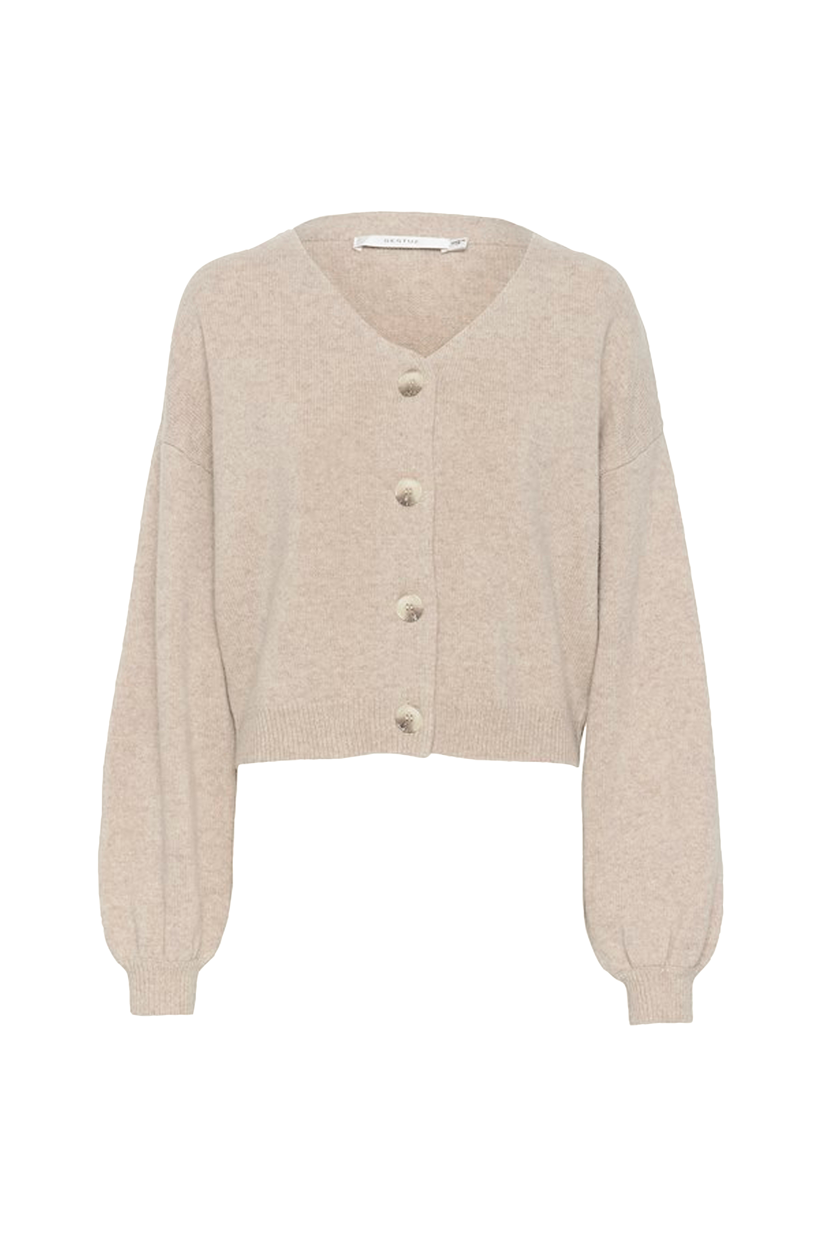 • Bred, glatstrikket model• V-udskæring med bred kant• Store knapper foran• Nedsænket skulder med langt ærme• Ribstrik ved manchetterne og ved nederste kant
