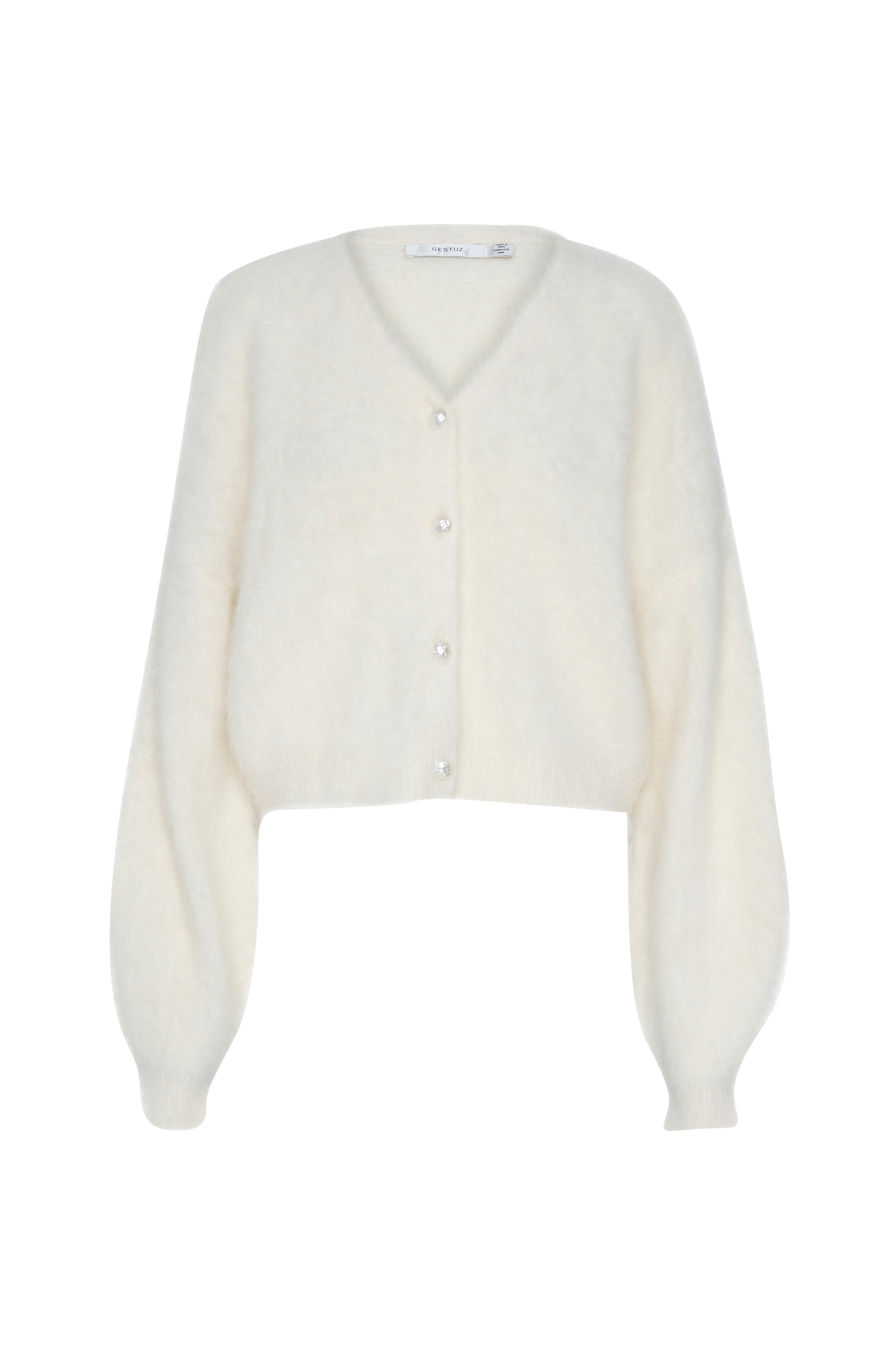 • Fintstrikket, blød, luftig cardigan med lange arme• V-hals• Knapstolpe med dekorative, lyse knapper foran• Ribstrik ved manchetterne og ved nederste kant• Nedsænket skulder