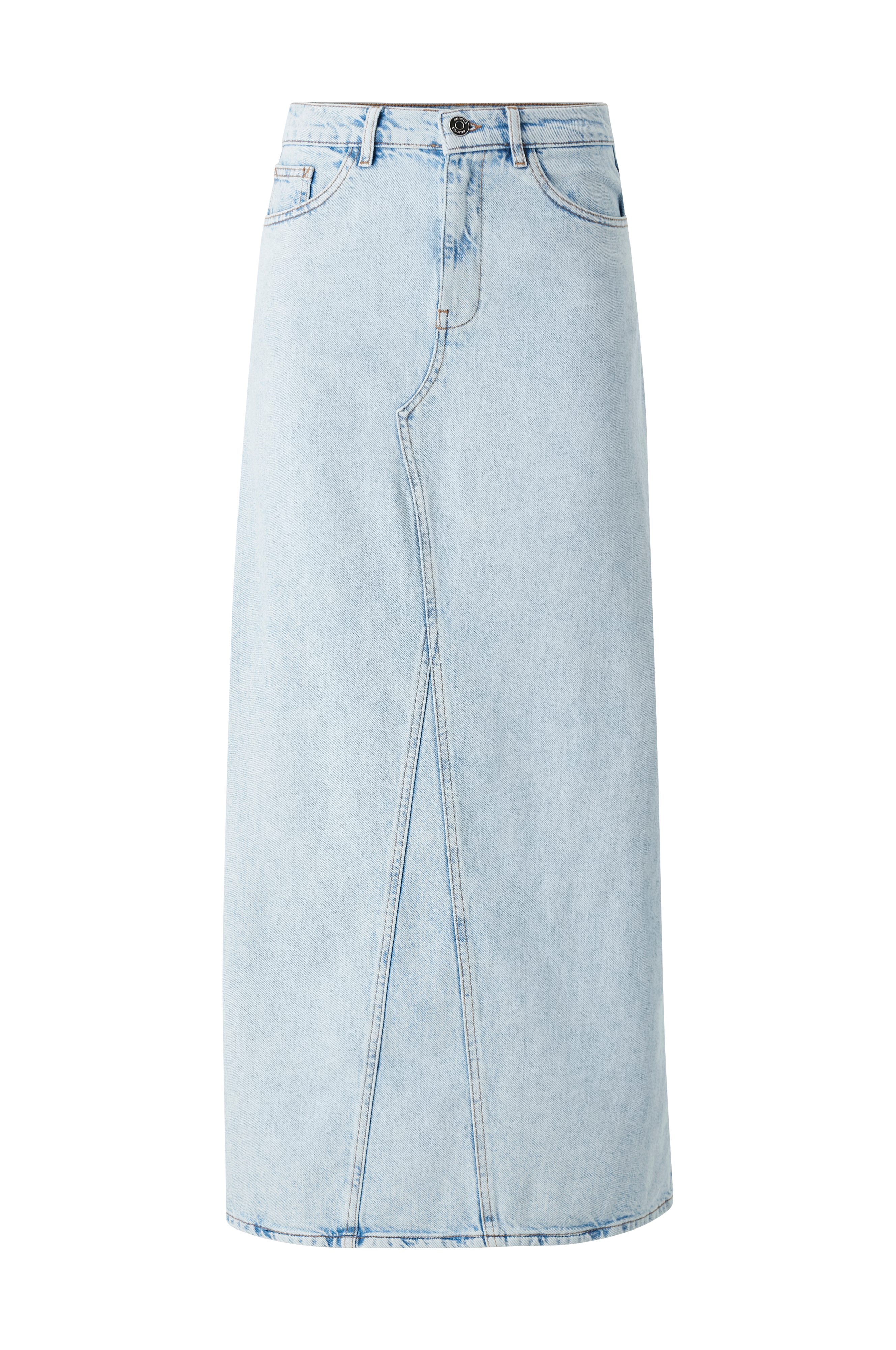 • Maxi nederdel i denim• Femlommemodel• Gylp med lynlås• Høj slids bagpå• Længde: 96 cm i størrelse 36
