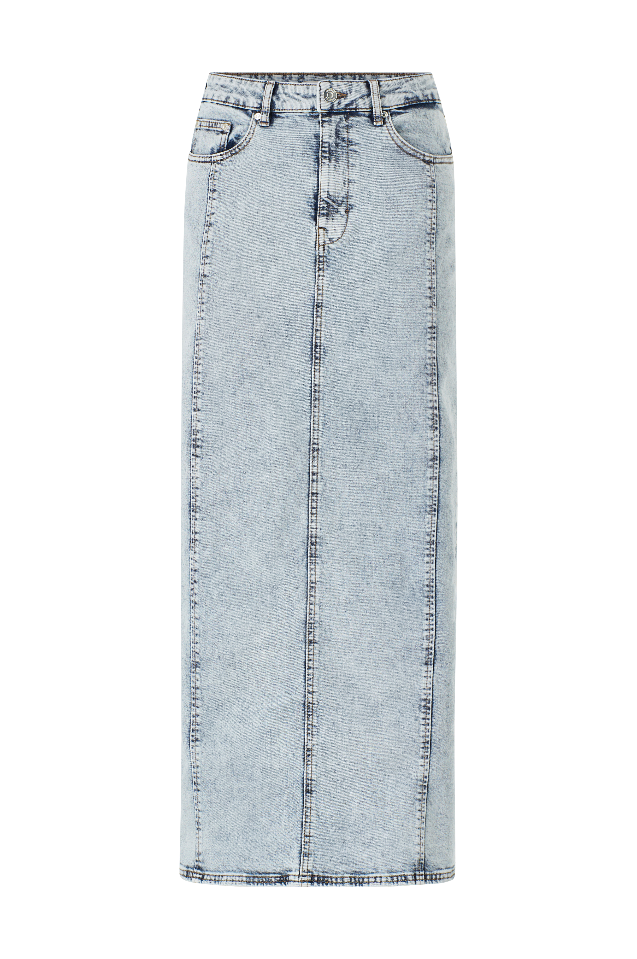 • Ankellang nederdel i strækdenim• Femlommemodel• Gylp med lynlås• Længde: 98 cm i størrelse 36
