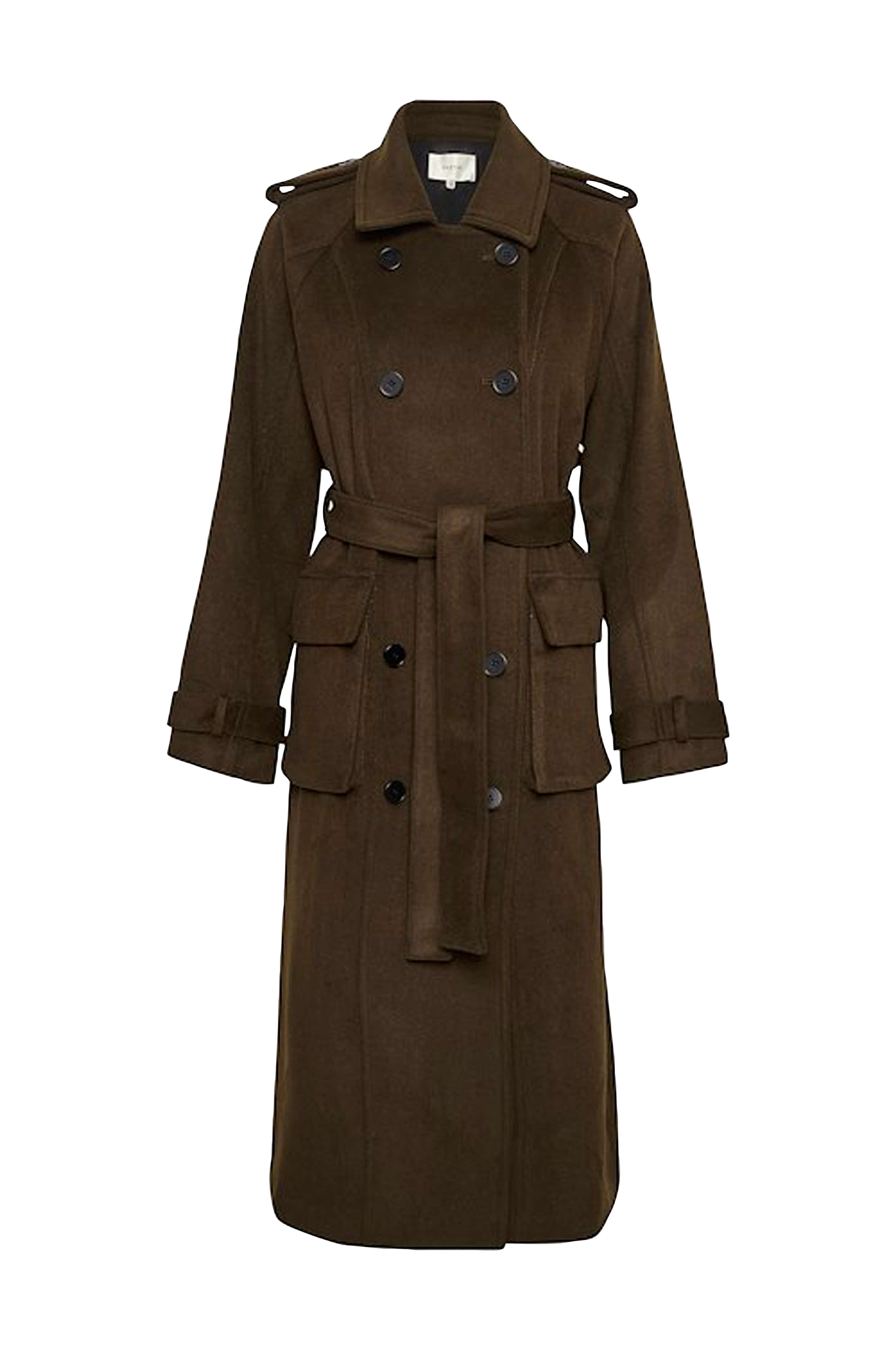 • Frakke i uldblanding • Dobbeltbrystet model • Skulderstropper • Justérbar rem ved ærmeafslutningerne med to knapper • To lommer • Aftageligt bæltespænde ved taljen • Slids nede bagved • Vævet, glat for • Løs, hængende linning bagpå • Længde: 120 cm i størrelse 36