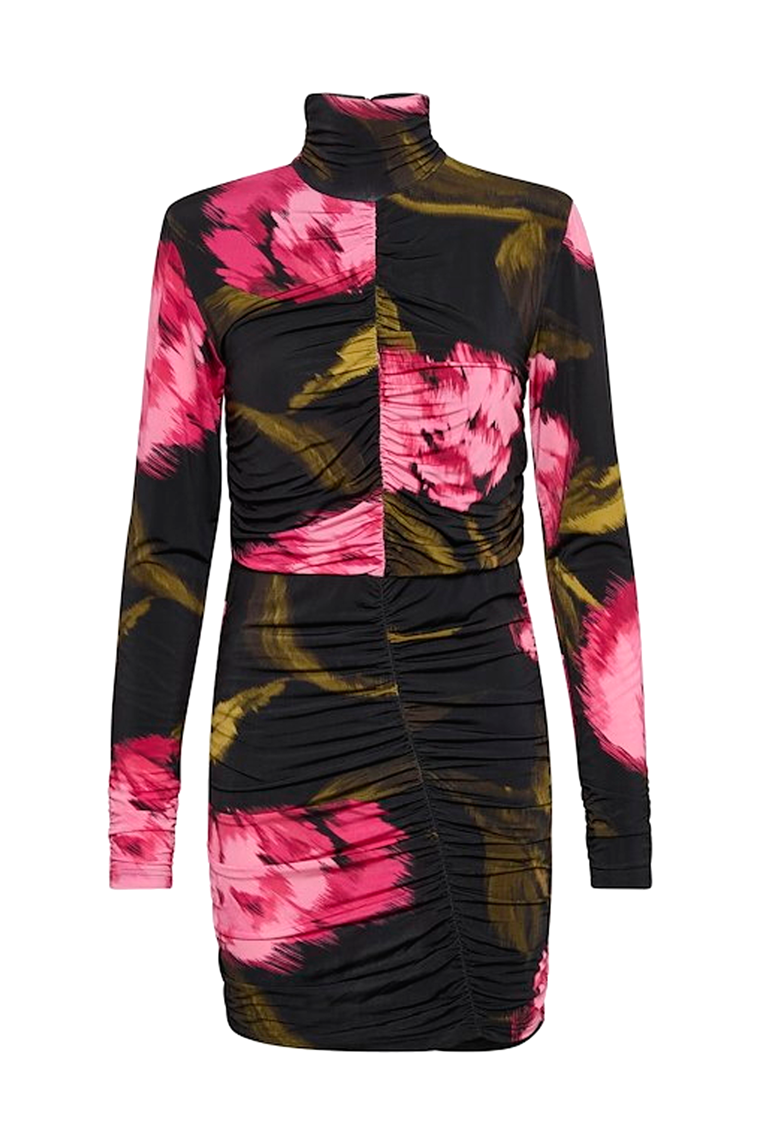 • Figursyet model med elastiske draperinger• Høj krave med lynlås i ryggen• Langt ærme• Skulderpuder• Længde: 93 cm i størrelse S