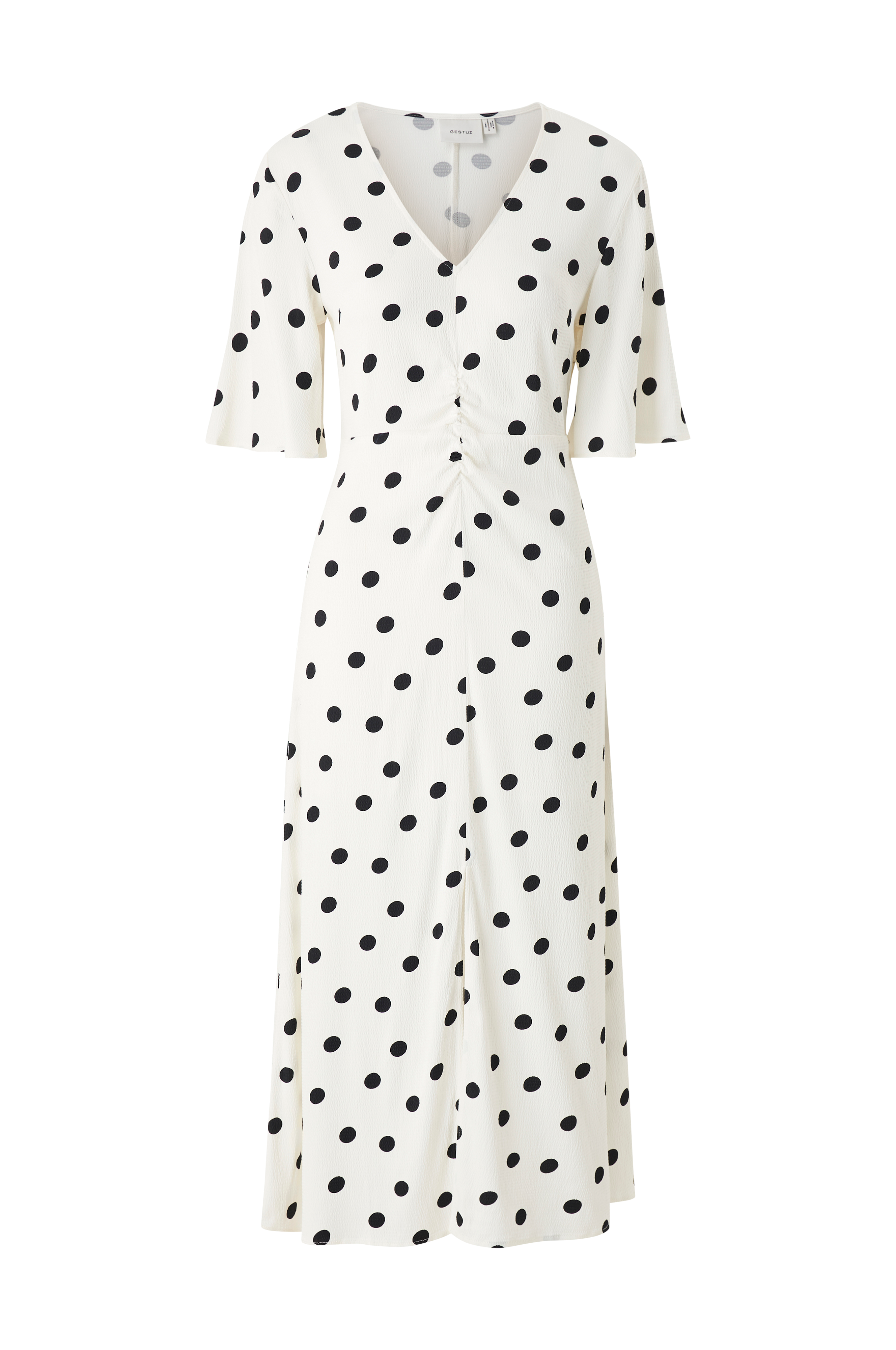 • Prikket kjole• Kvalitet med glans• V-udskæring• Halvlange, 3/4 lange ærmer• Samling foran• Slids foran• Skjult lynlås i siden• Længde: 127 cm i størrelse 34
