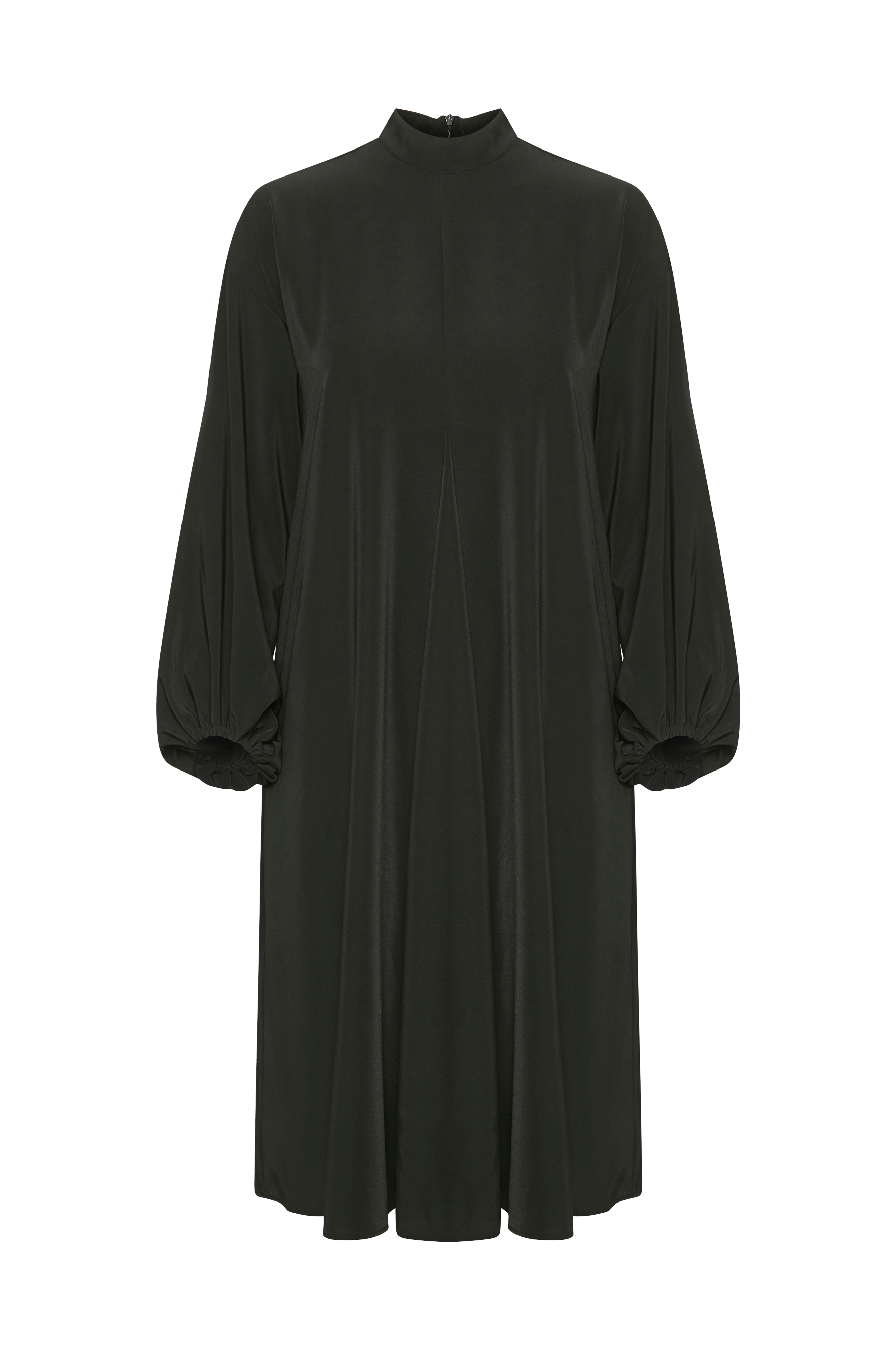 Vid oversizemodel med bred, indsat kile midt foran og midt bagpå fra taljen og ned. Halvhøj, påsyet krave med skjult lynlås i ryggen og lav skulder med vide ærmer som har indsat elastik i ærmekanten. Indsatte lommer i sidesømmene. Længde ca. 111 cm i str. 36.