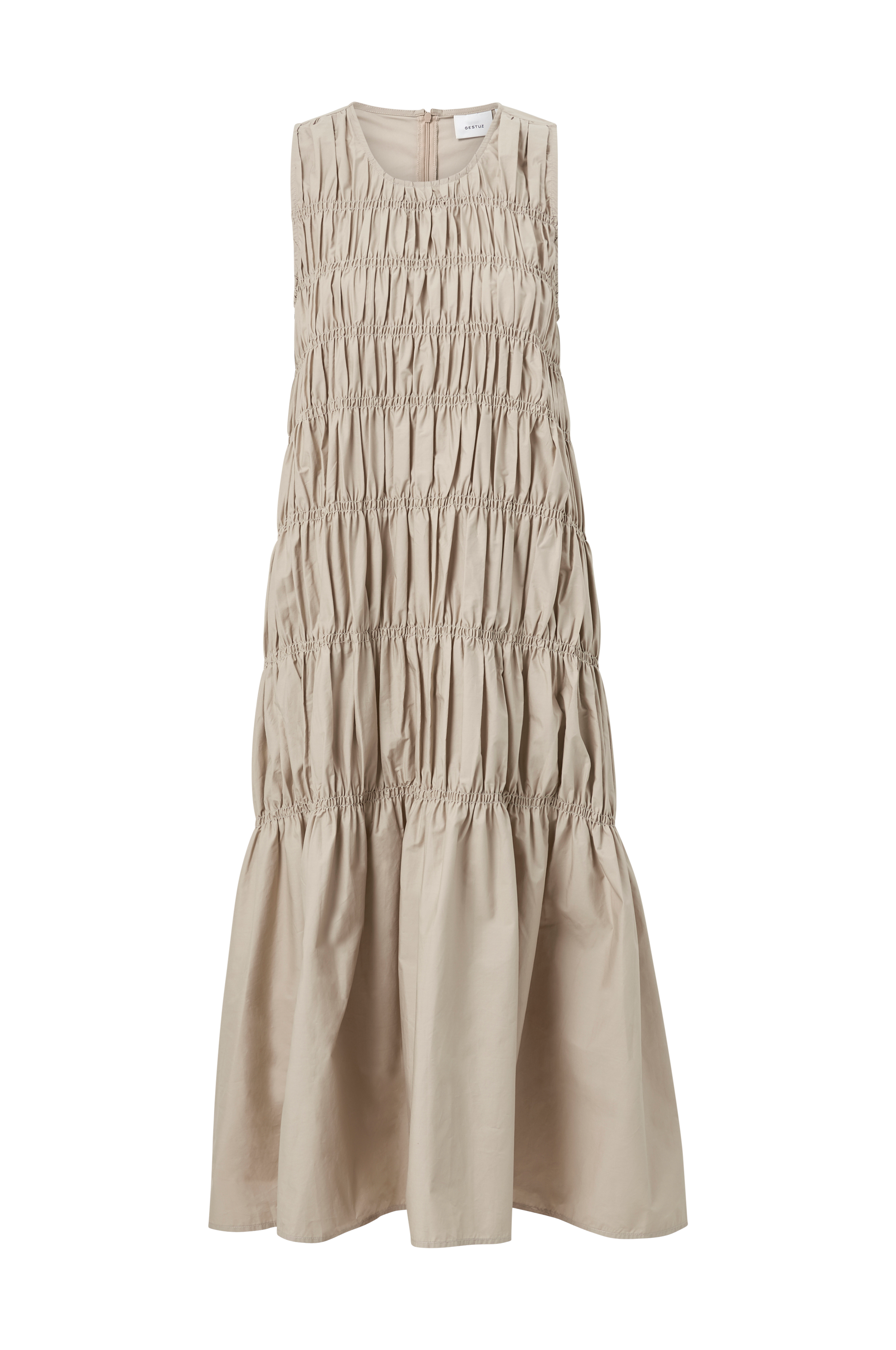 Ærmeløs kjole i vid oversizemodel med draperet elastiksømme på forstykket. Rund hals og skjult lynlås i ryggen samt indsatte lommer i siderne. Længde ca. 126 cm i str. 36.