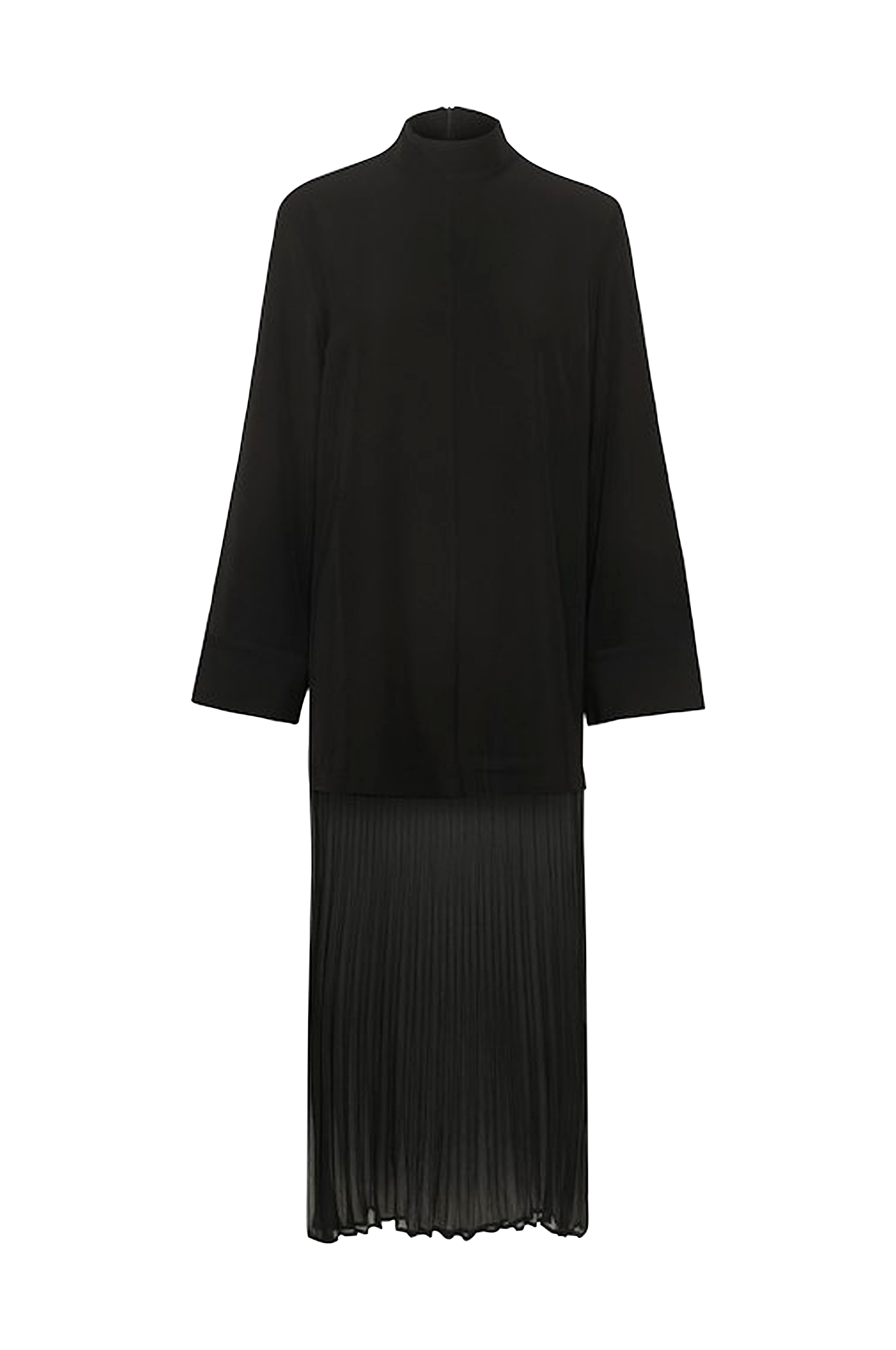 • Lang, lige model• Halvhøj krave med lynlås i ryggen• Lige, ekstra langt ærme• Plisseret indlæg i chiffon nederst• Skulderpuder• Længde: 136 cm i størrelse 36