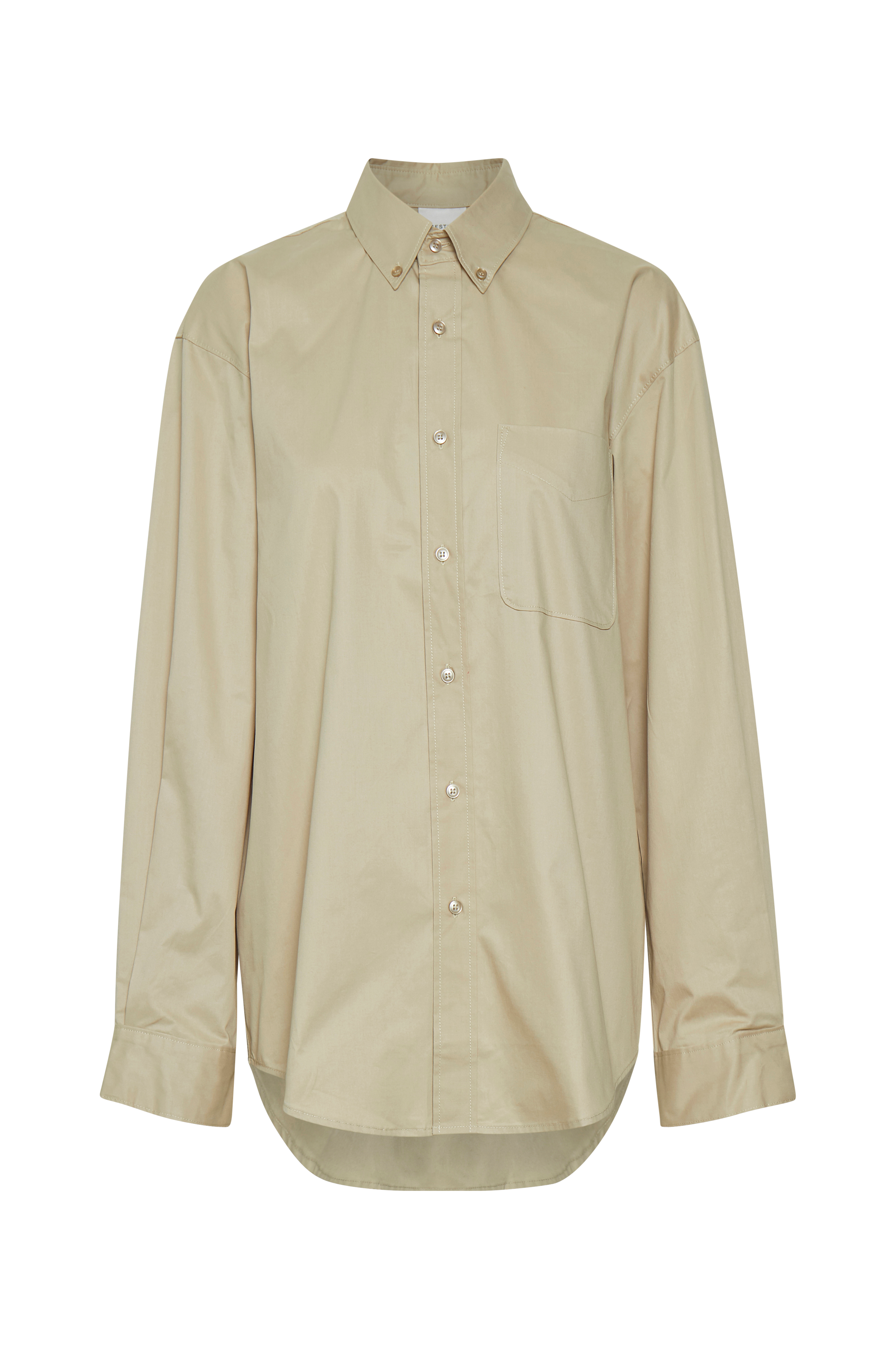 Oversizemodel med button-down-krave og pyntestukket stolpelukning. Afskåret skulderbærestykke med lagt læg bagpå og en påsyet brystlomme. Afrundet kant forneden og manchet i ærmekanten.