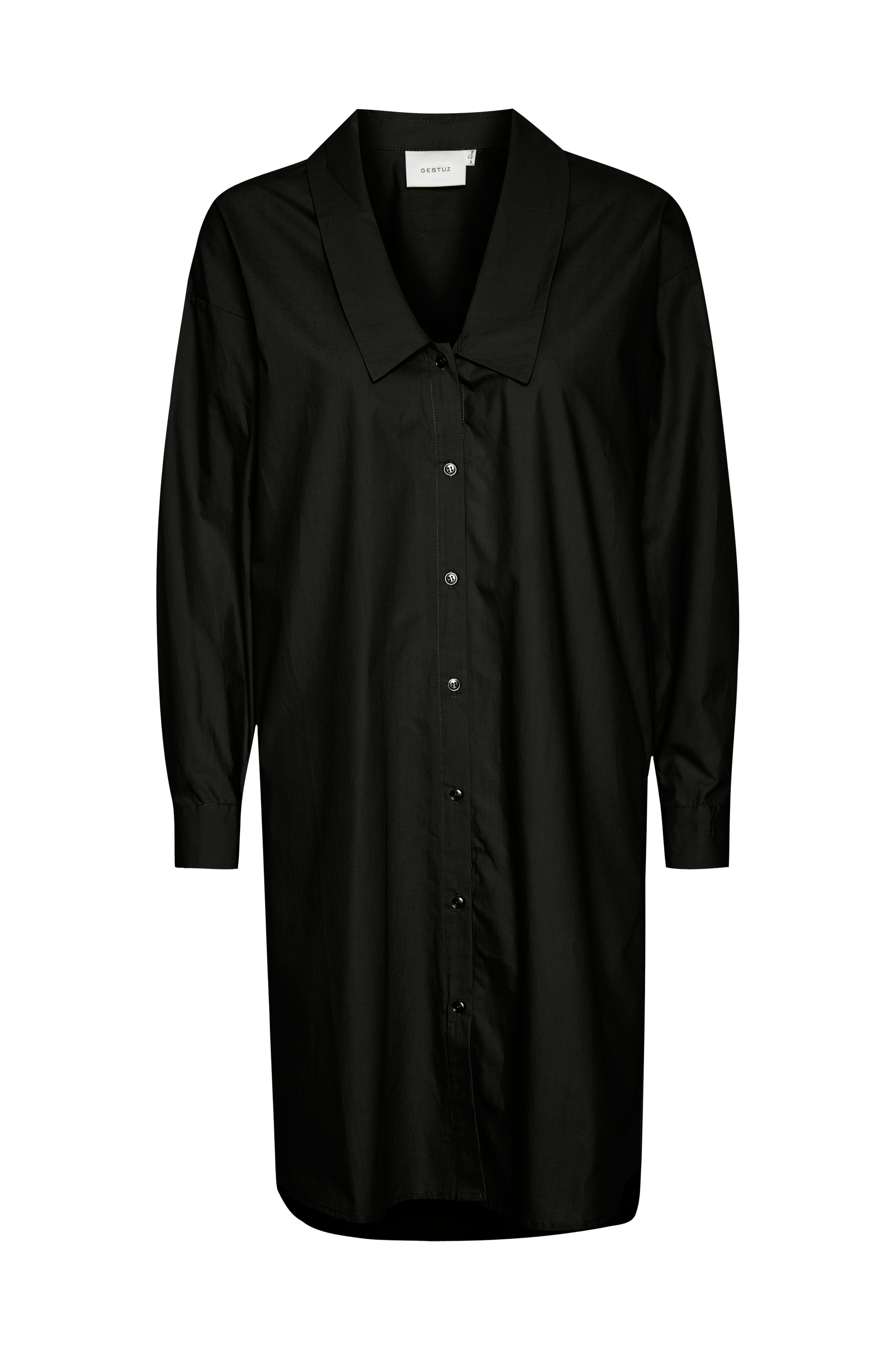 Lige oversizemodel med stor krave som er gennemknappet foran. Langt ærme med manchet i ærmekanten og afskåret skulderbærestykke med lagte modgående læg bagpå. Bindebælte i taljen og indsatte lommer i siderne samt afrundet kant forneden. Længde ca. 104 cm i str. 36.