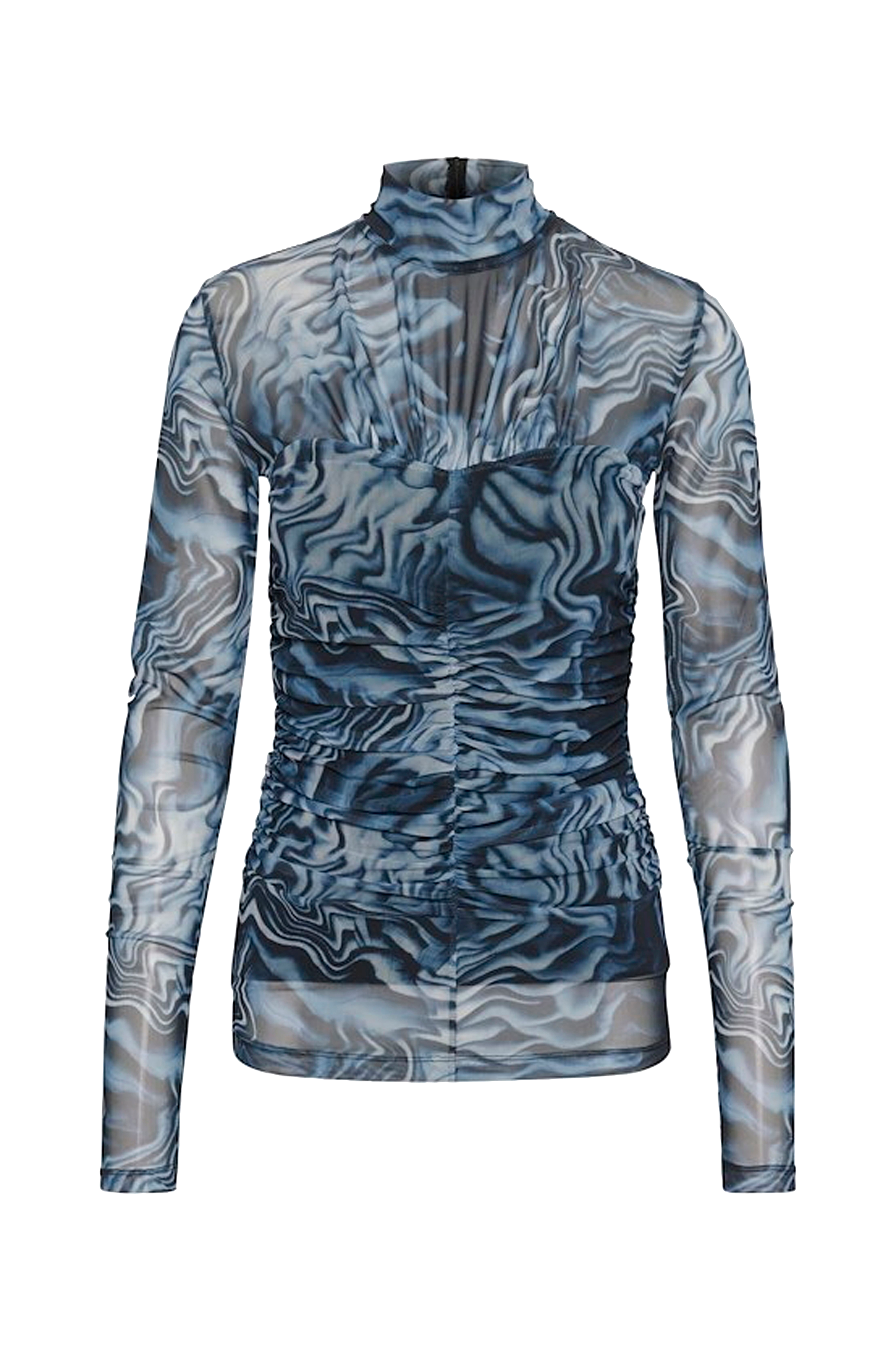 • Transparent top i meshtrikot• Drapering foran• Opretstående krave• Skjult lynlås bagpå• Halvforet