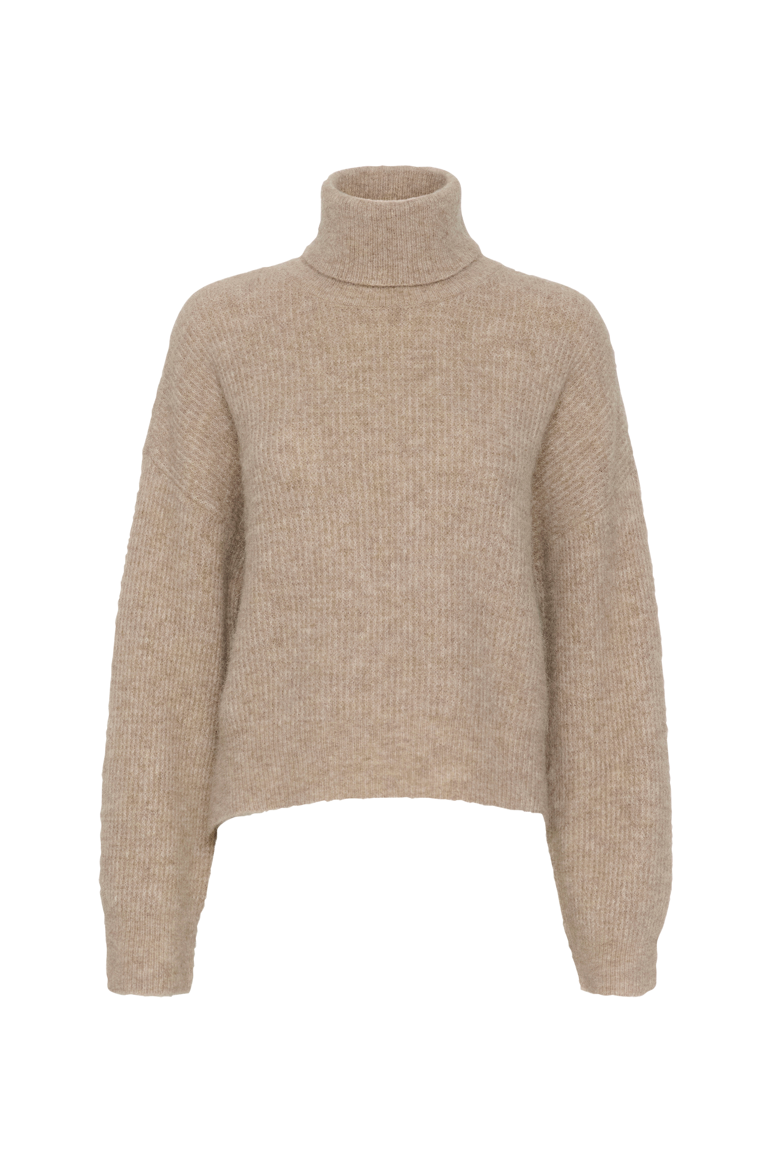 • Bred model i uldmiks• Høj, ribstrikket krave• Nedsænket skulder med langt, lige ærme• Ventilation nede i siderne med længere bagside