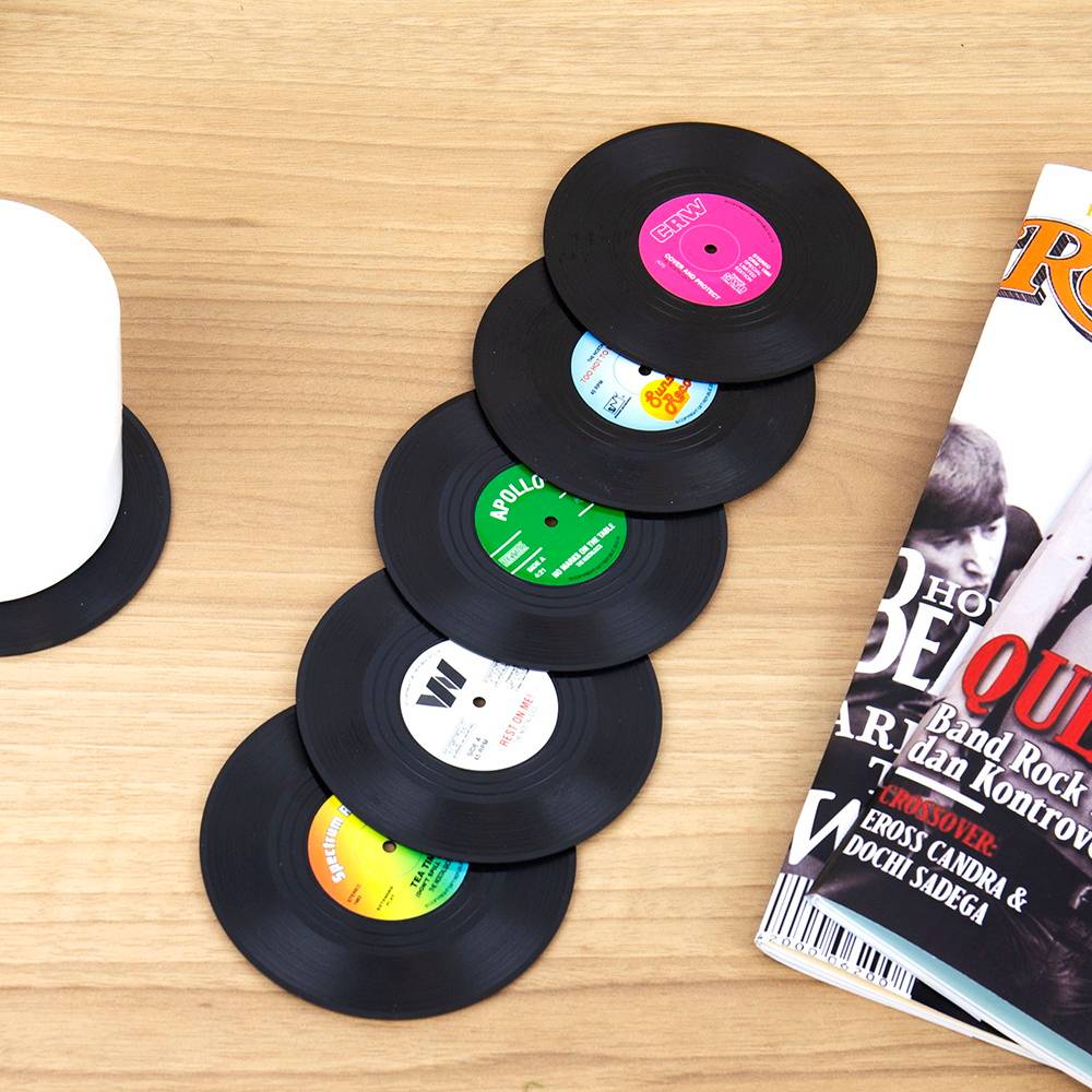 Stilfulde retro-vinylpladeunderlæggere, hver med et forskelligt plademærke-design, hvilket gør dem perfekte til old school-musikelskere!