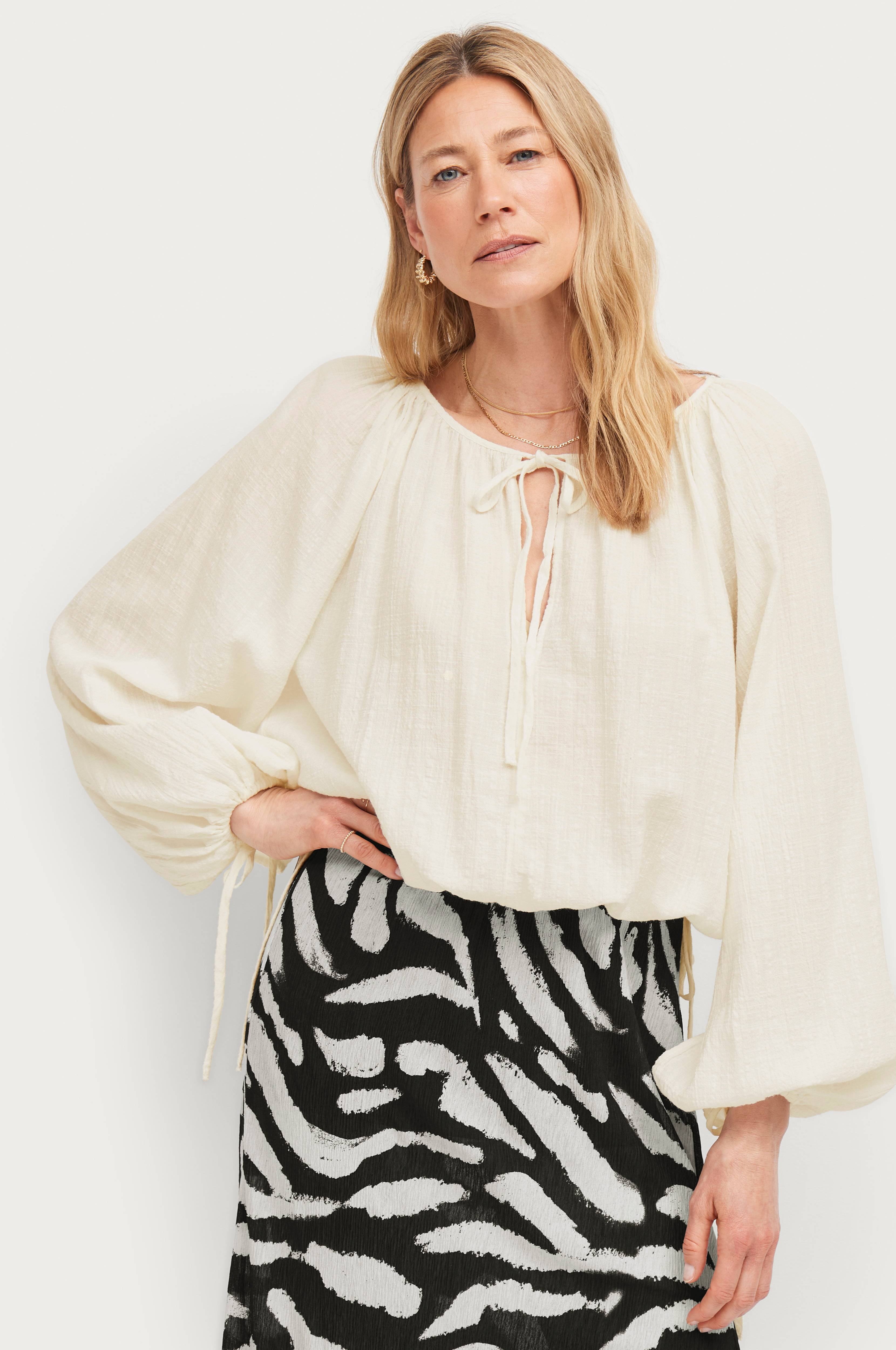 • Afslappet, firkantet pasform• Vævet, gennemsigtig kvalitet med let struktur• Bindebånd i halsen, ved ærmeafslutningerne og ved nederste kant