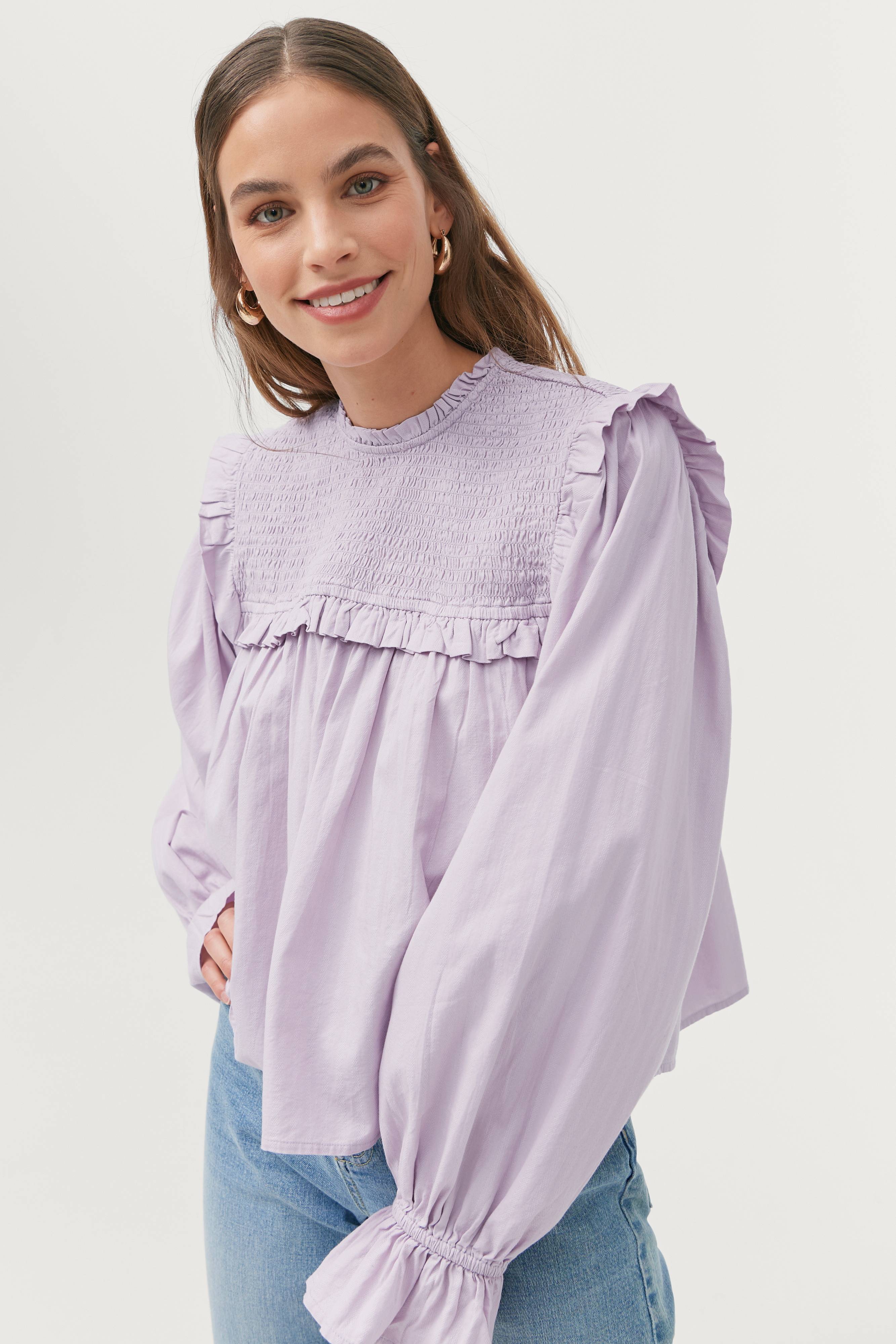 A-formet oversizemodel med skulderbærestykke i smockelastik og med lille flæsekant rundt om. Også lille flæse i halsen med slids og knap i nakken. Langt, ekstra vidt raglanærme med indsat elastik forneden på ærmet.