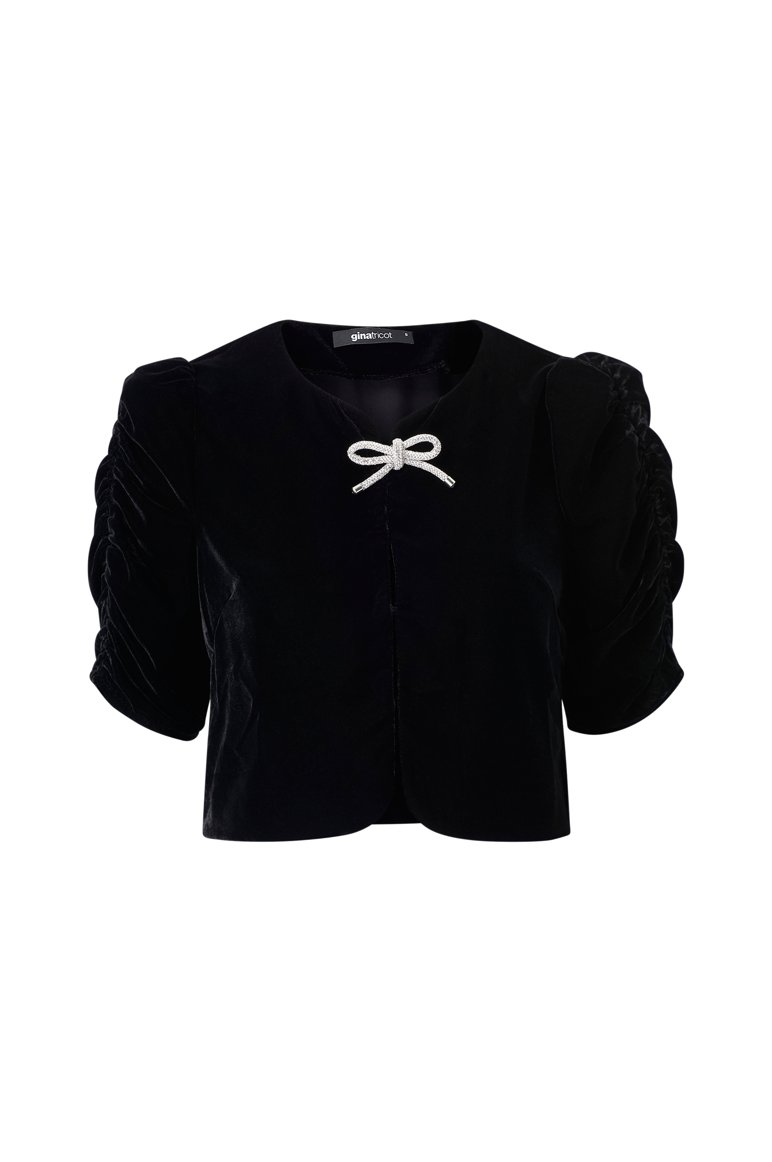 • Kort bluse i velour• Rund halsudskæring• Dekorativt, sølvglitrendet bånd oppe foran• Hægtelukning foran• Korte ballonærmer med drapering ved siden af