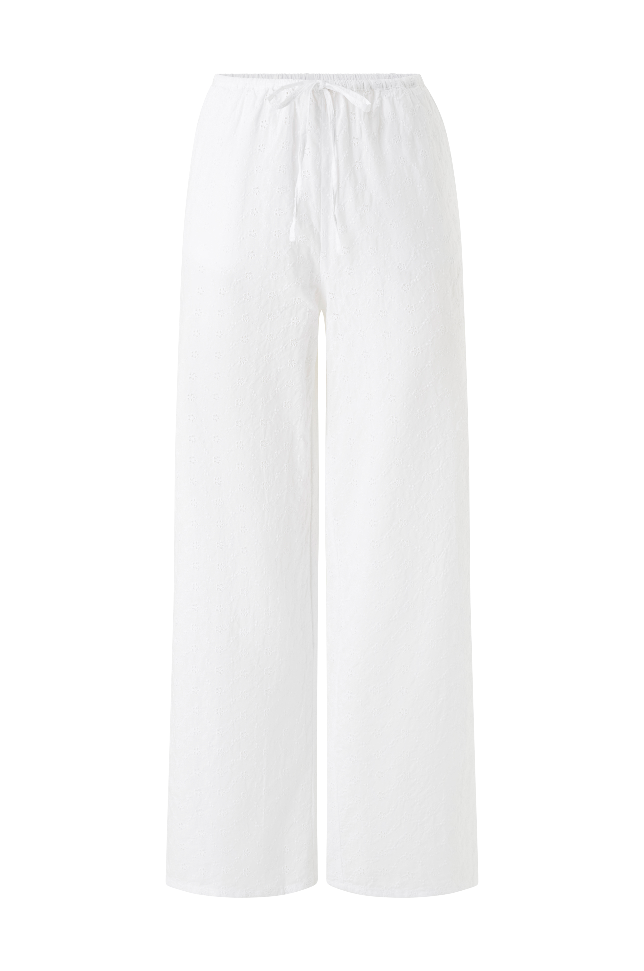 • Bukser med hulmønstrede broderier• Justérbar talje med træksnørre• Sidelommer• Brede ben• Indre benlængde: 75 cm i størrelse S