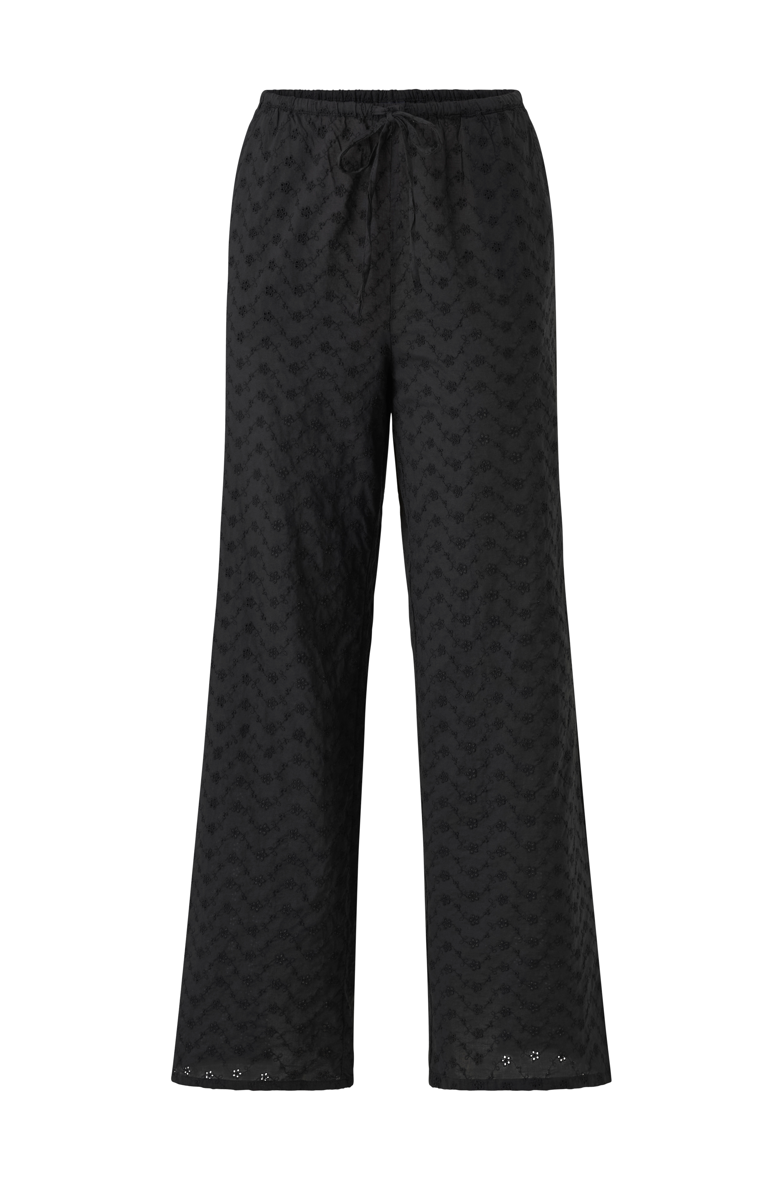 • Bukser med hulmønstrede broderier• Justérbar talje med træksnørre• Sidelommer• Brede ben• Indre benlængde: 75 cm i størrelse S