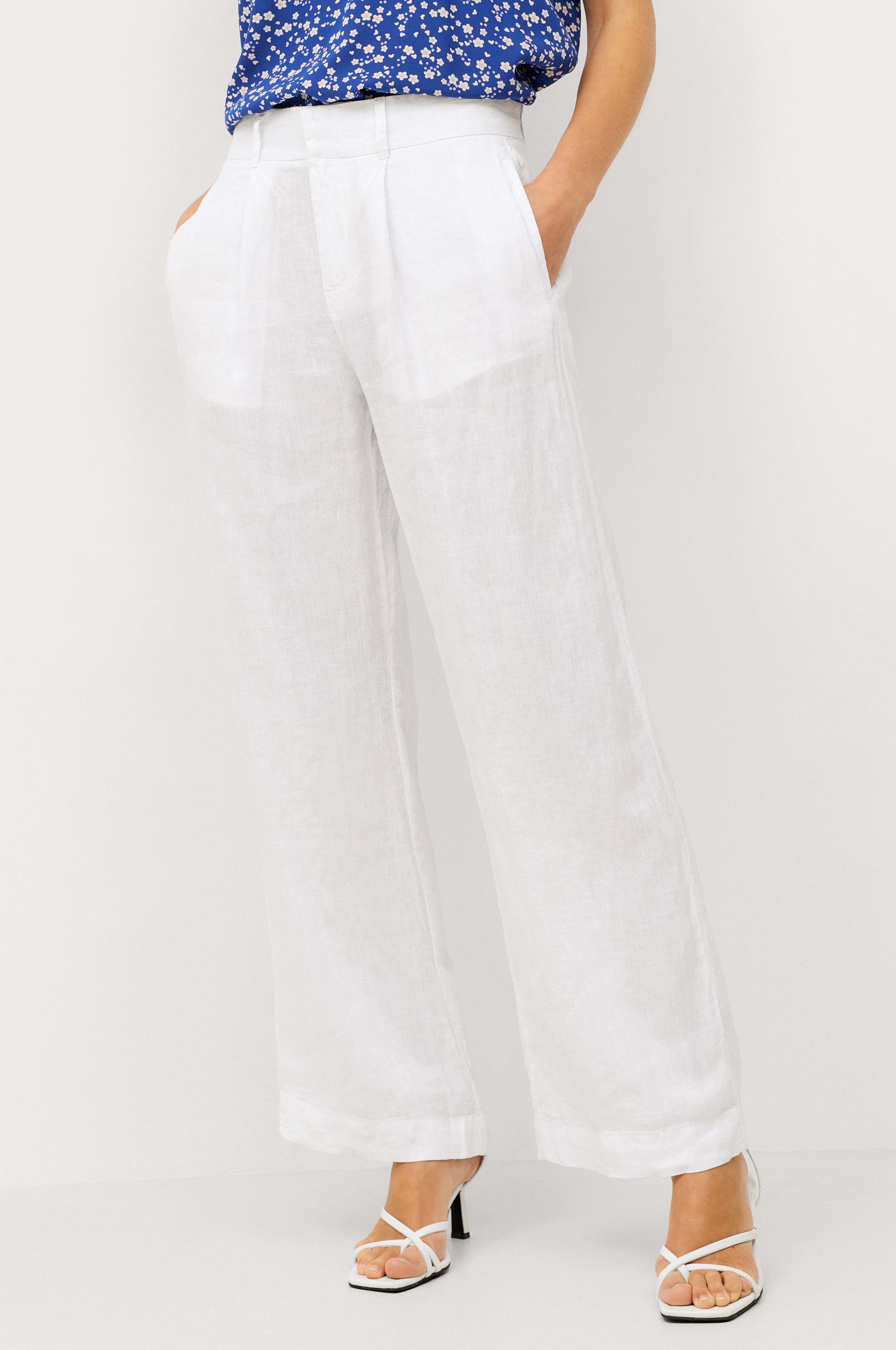 • Hørbukser med høj talje • Løs pasform • Lige ben med en fold oppe foran • Sidelommer • Skjult hægtelukning • Elastik bagpå ved taljen • Gylp med lynlås