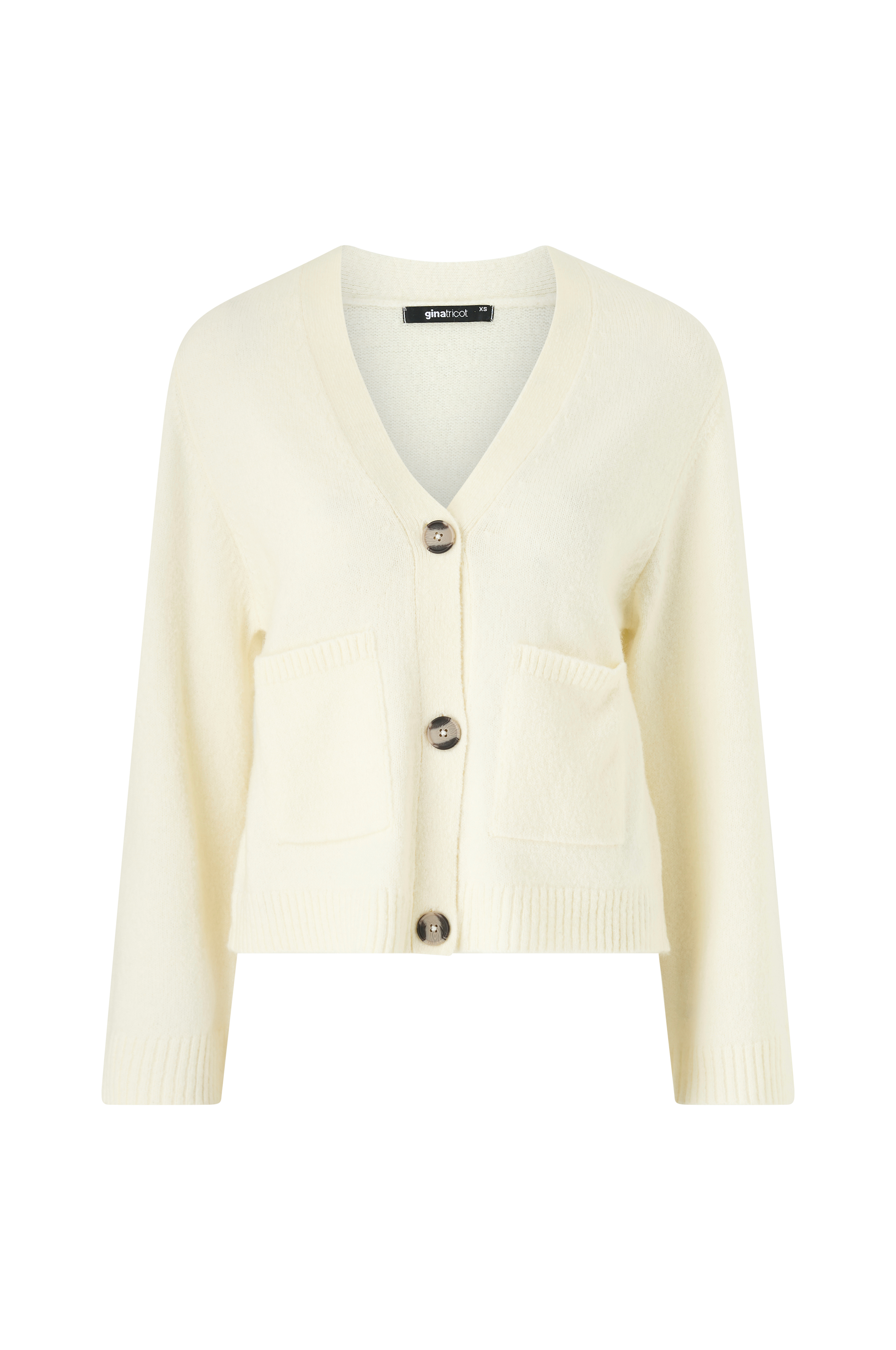 • Strikket cardigan med v-udskæring• Nedsænkede skuldre• Lange ærmer• Knaplukning• To lommer• Ribstrik ved manchetterne og ved nederste kant• Afslappet pasform