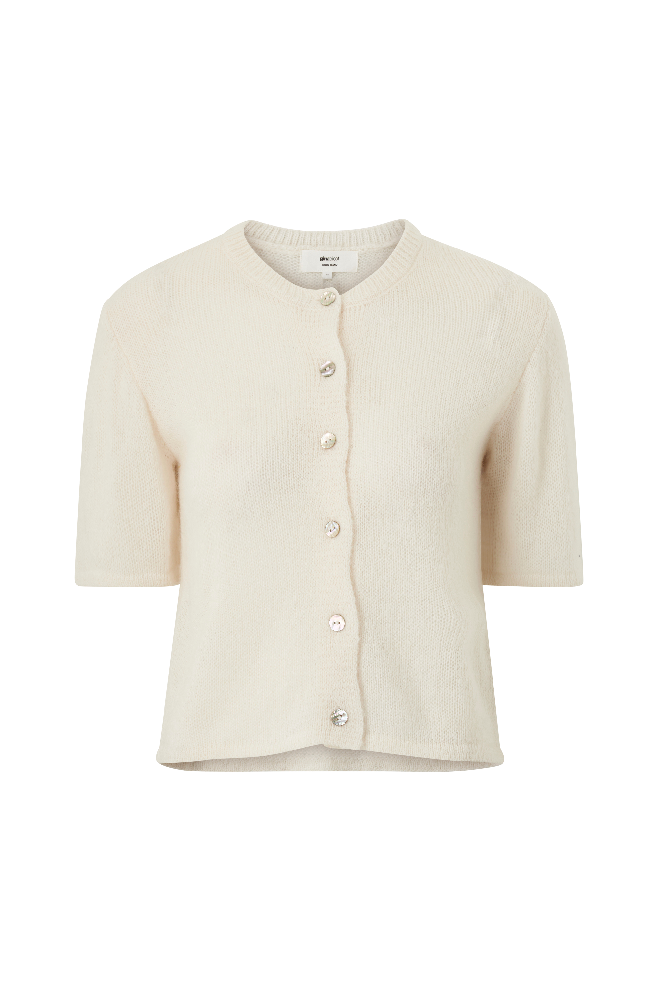 • Løststrikket cardigan med rund, ribbet halsudskæring• Skinnende knapper ved fronten• Korte ærmer