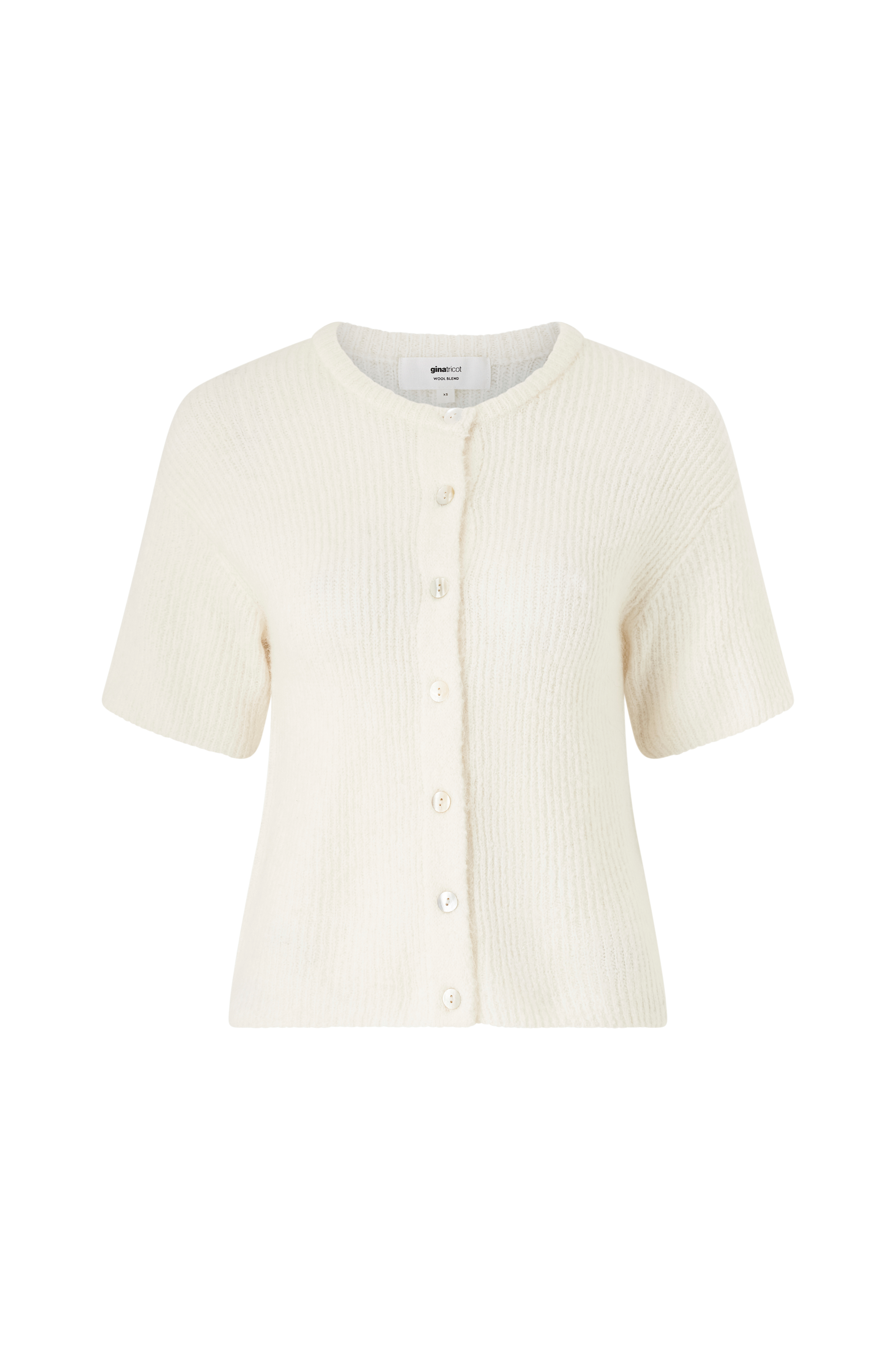 • Strikket cardigan i uldmiks• Rund halsudskæring• Knaplukning• Korte ærmer