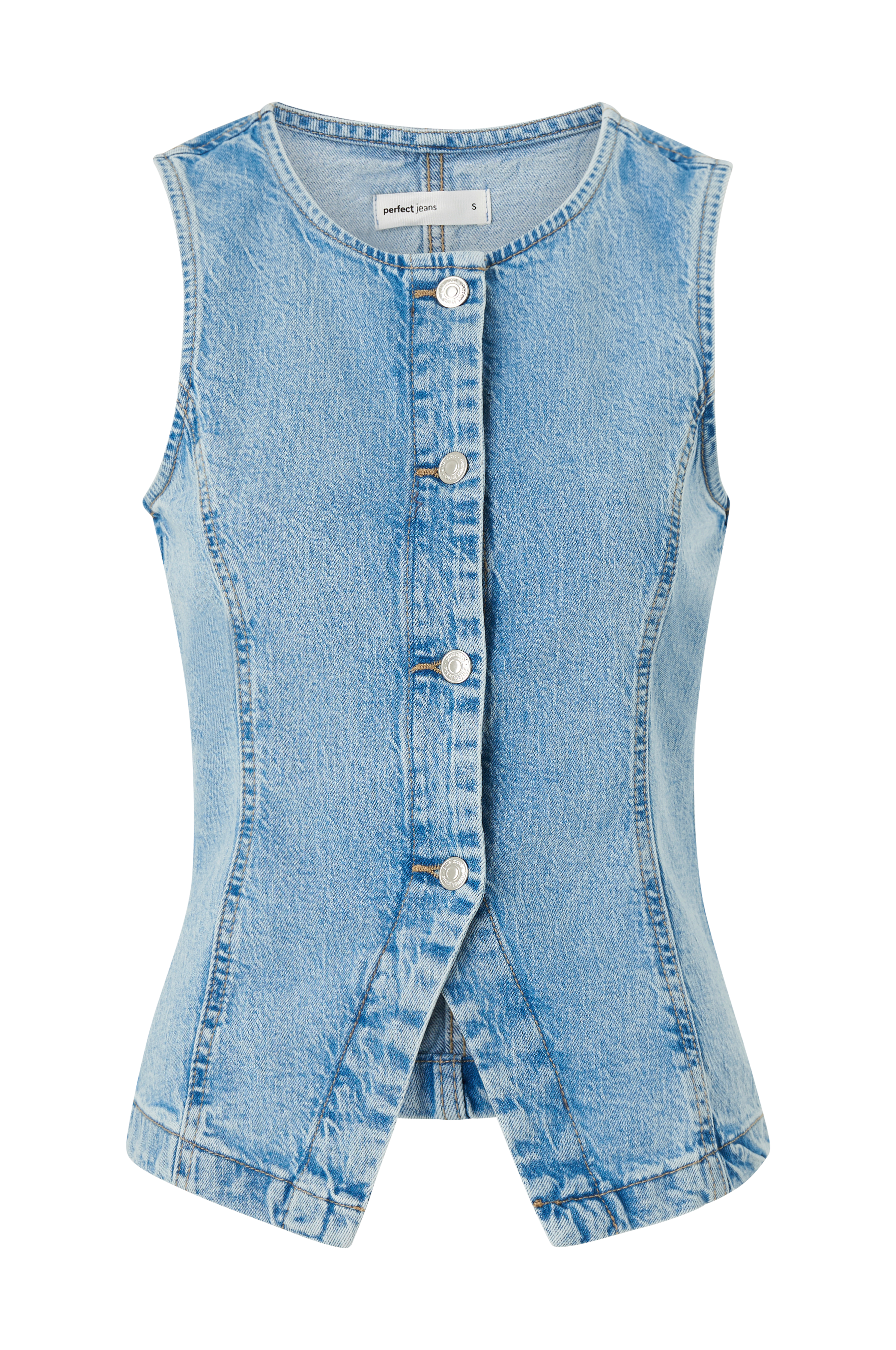 • Denimvest i elastisk bomuldsdenim• Figursyet pasform• Sølvfarvede metalknapper• Rund halsudskæring