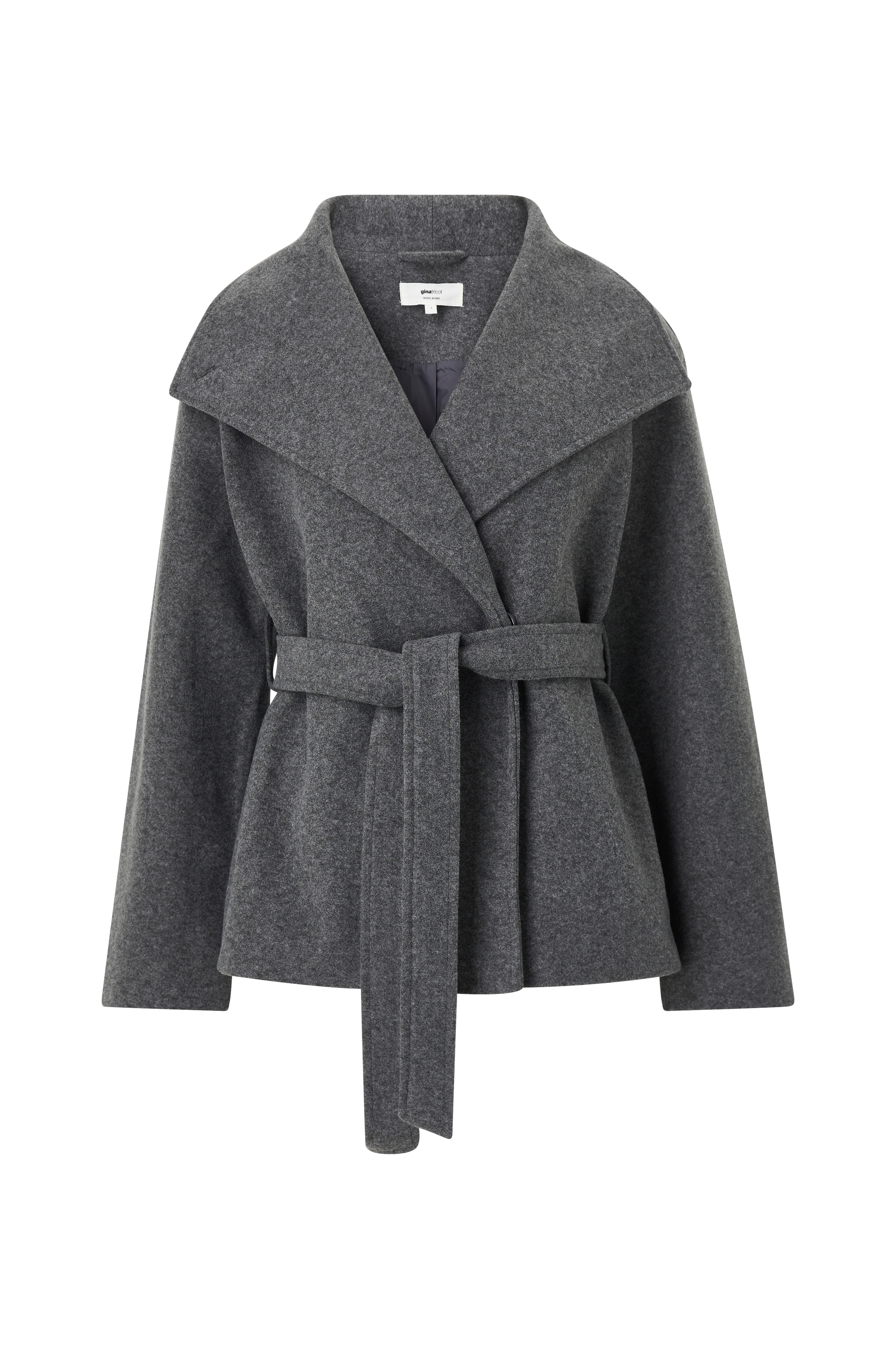 • Kort jakke i uldmiks med stor krave• Lukning med to skjulte knapper• Aftageligt bindebælte ved taljen• Sidelommer• Foret• Længde: 66 cm i størrelse S