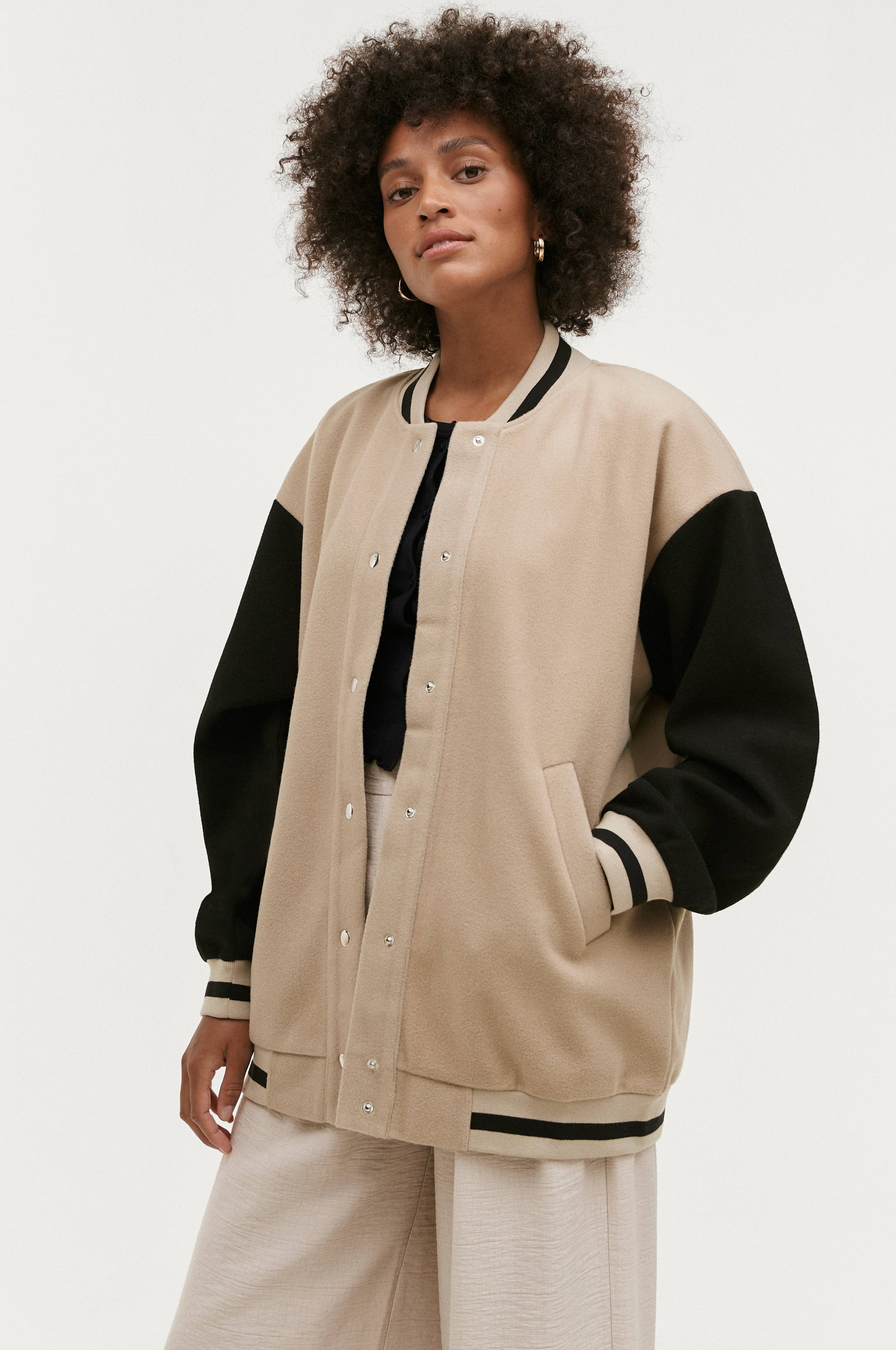 Baseballjakke i blød, filtet kvalitet med kontrastfarvede ærmer og stribede ribkanter ærmerne, kanten forneden og halsen. Trykknapper og lommer foran. Uforet. Længde ca. 74 cm i str. S.
