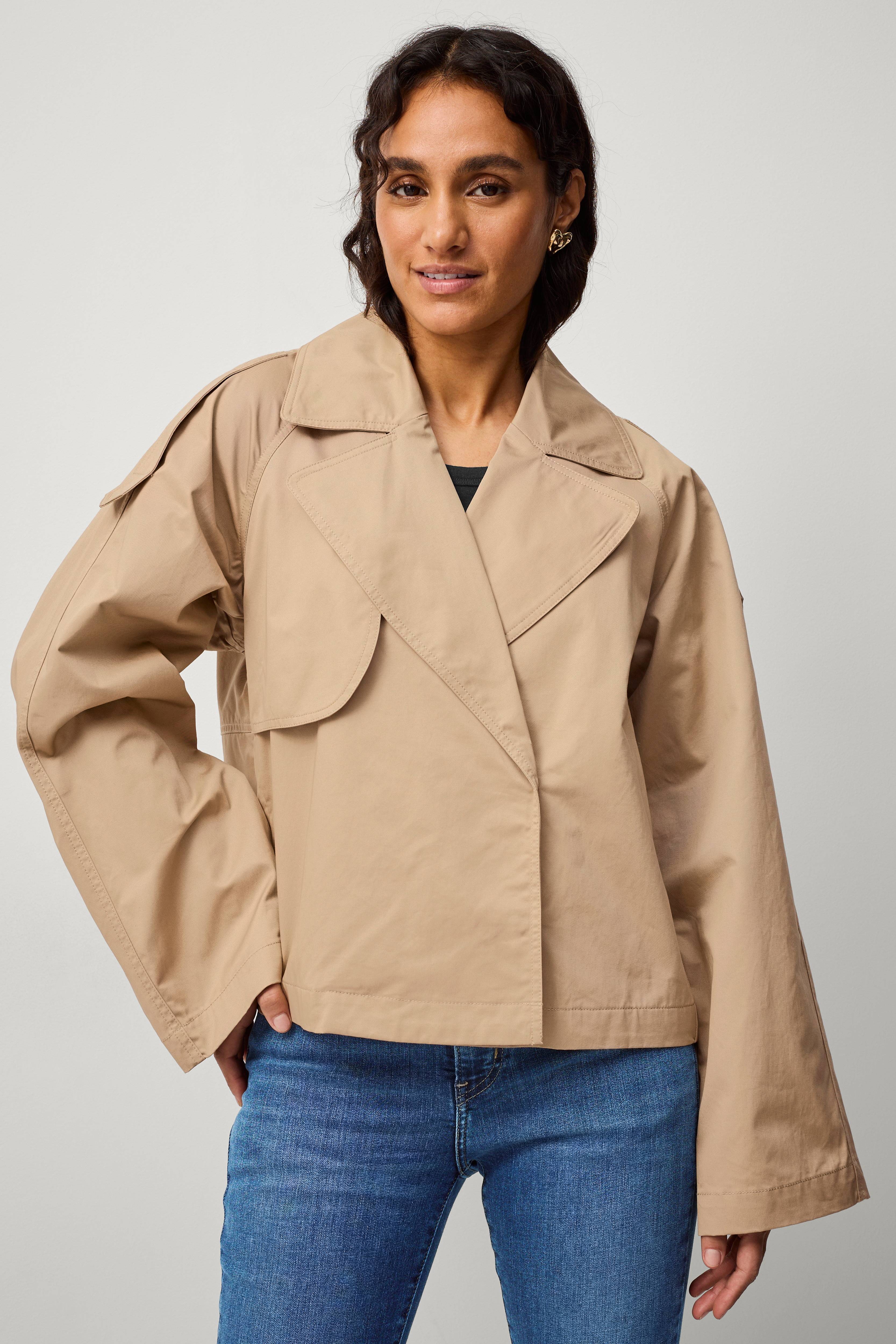 • Dobbelt knaplukning med skjulte trykknapper foran• Krave med revers• Sidelommer• Brede ærmer• Uforet• Længde: 57 cm i størrelse S