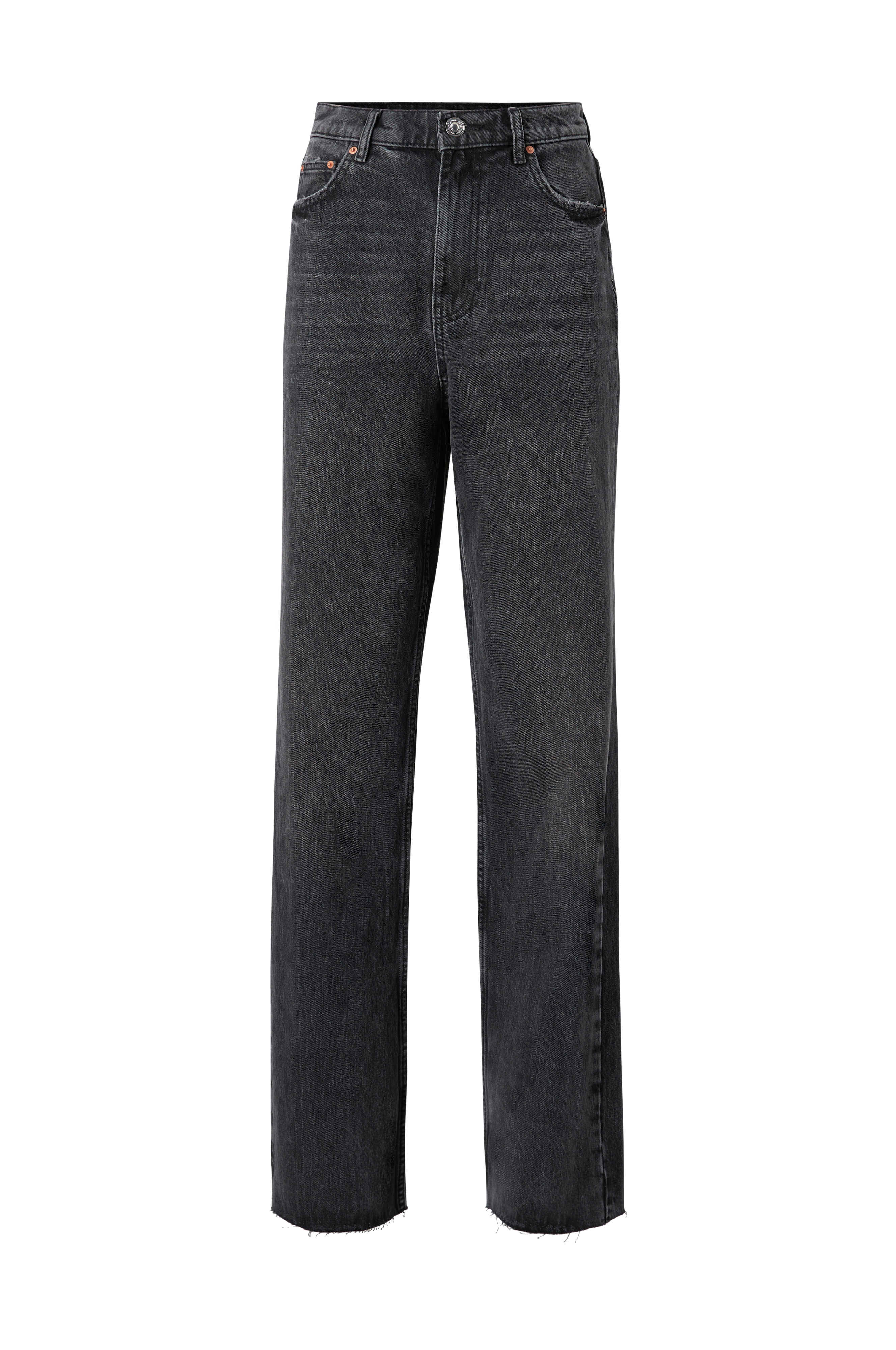 Jeans i lige, vid model med afklippet benkant. 5-lommemodel med lynlåsgylp. Slidte detaljer ved lommerne. I denim. Benlængde ca. 84 cm i str. 36.