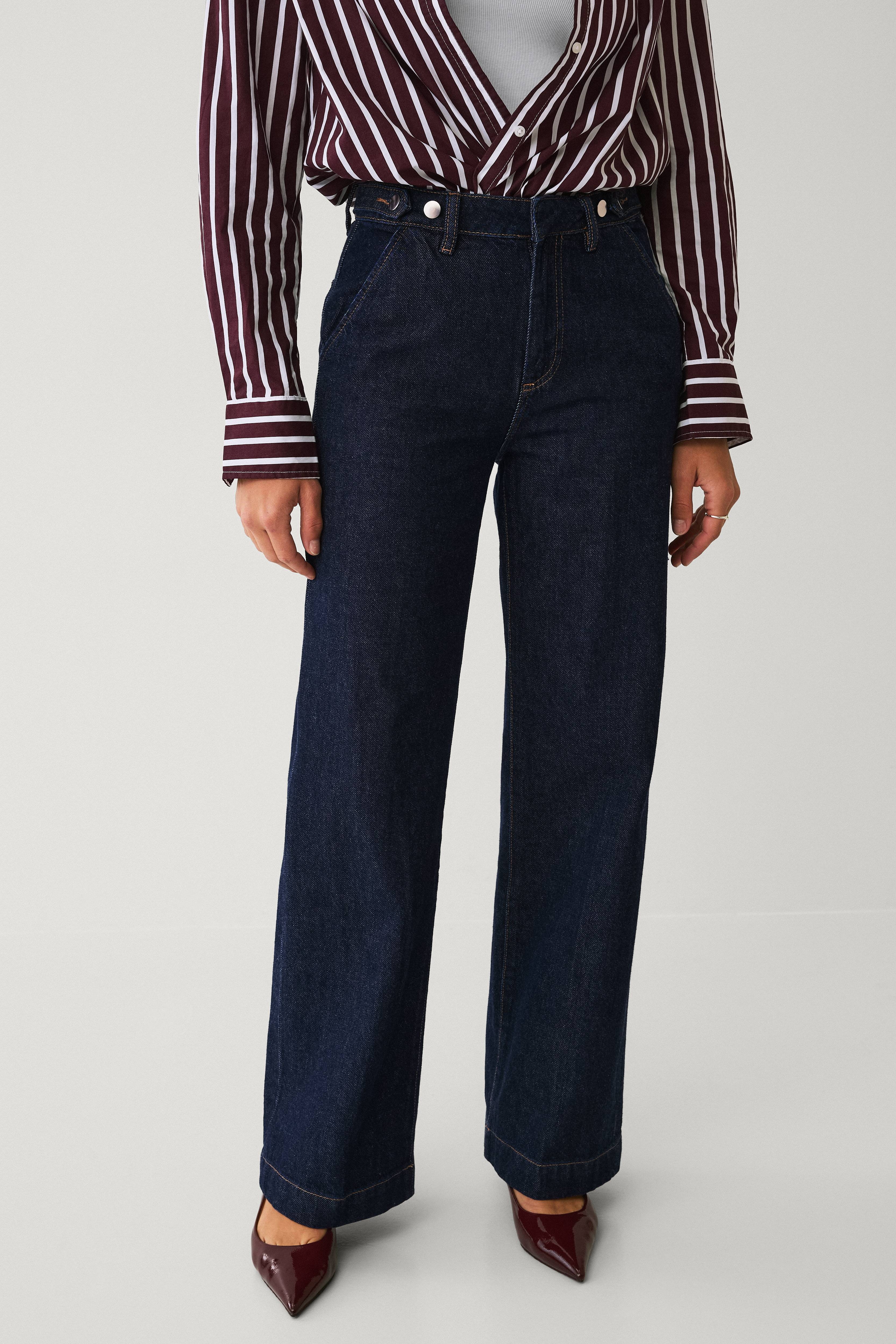 • Højtaljede jeans med brede ben• Justérbar talje med stropper• Gylp med lynlås med hægtelukning• Forlommer• Baglommer med låg og knap• Indre benlængde: 82 cm i størrelse 36