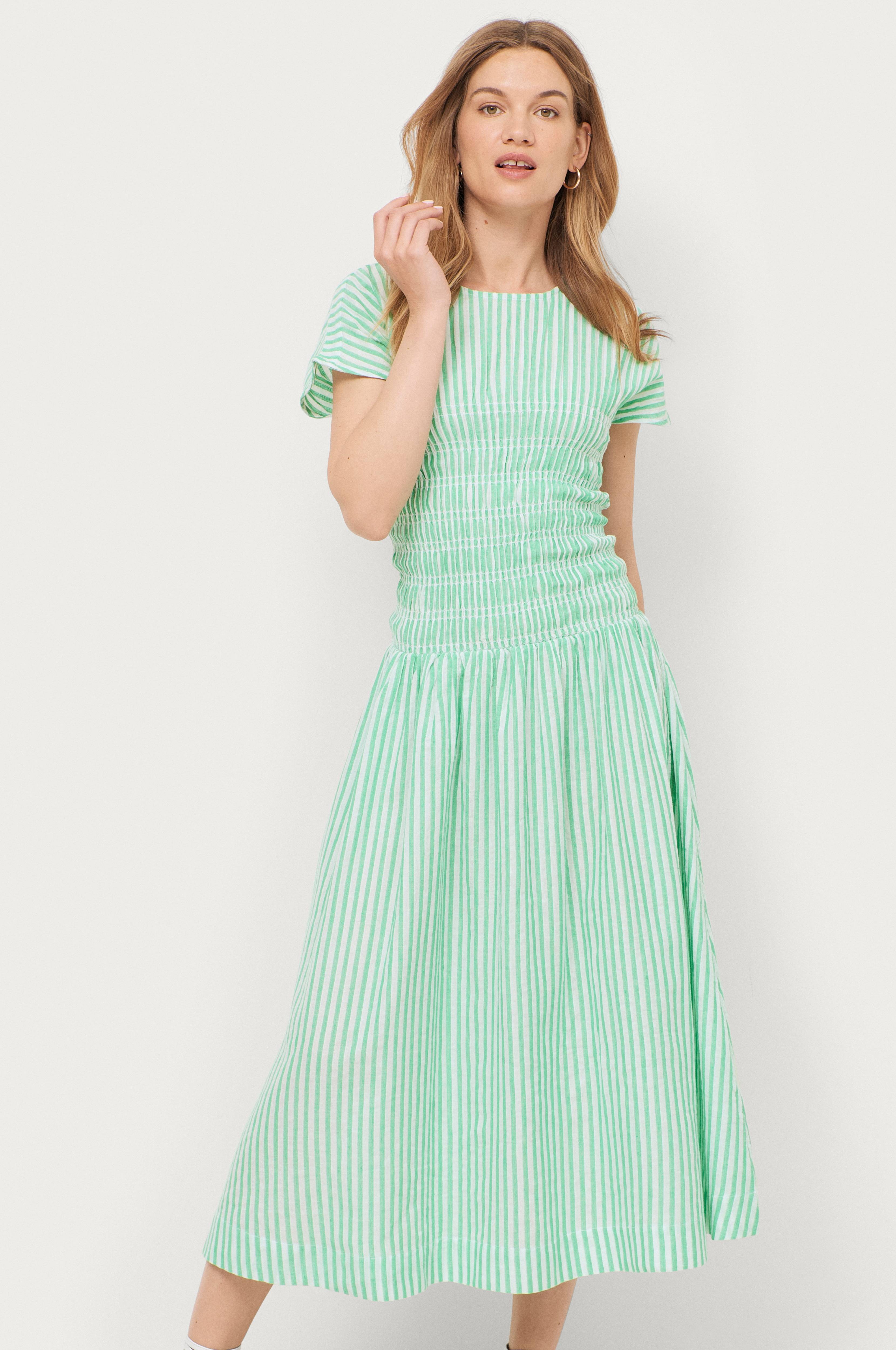 • Ankellang model• Korte ærmer• Smocket øvre del• Nederdel med svaj• Længde: 126 cm i størrelse S
