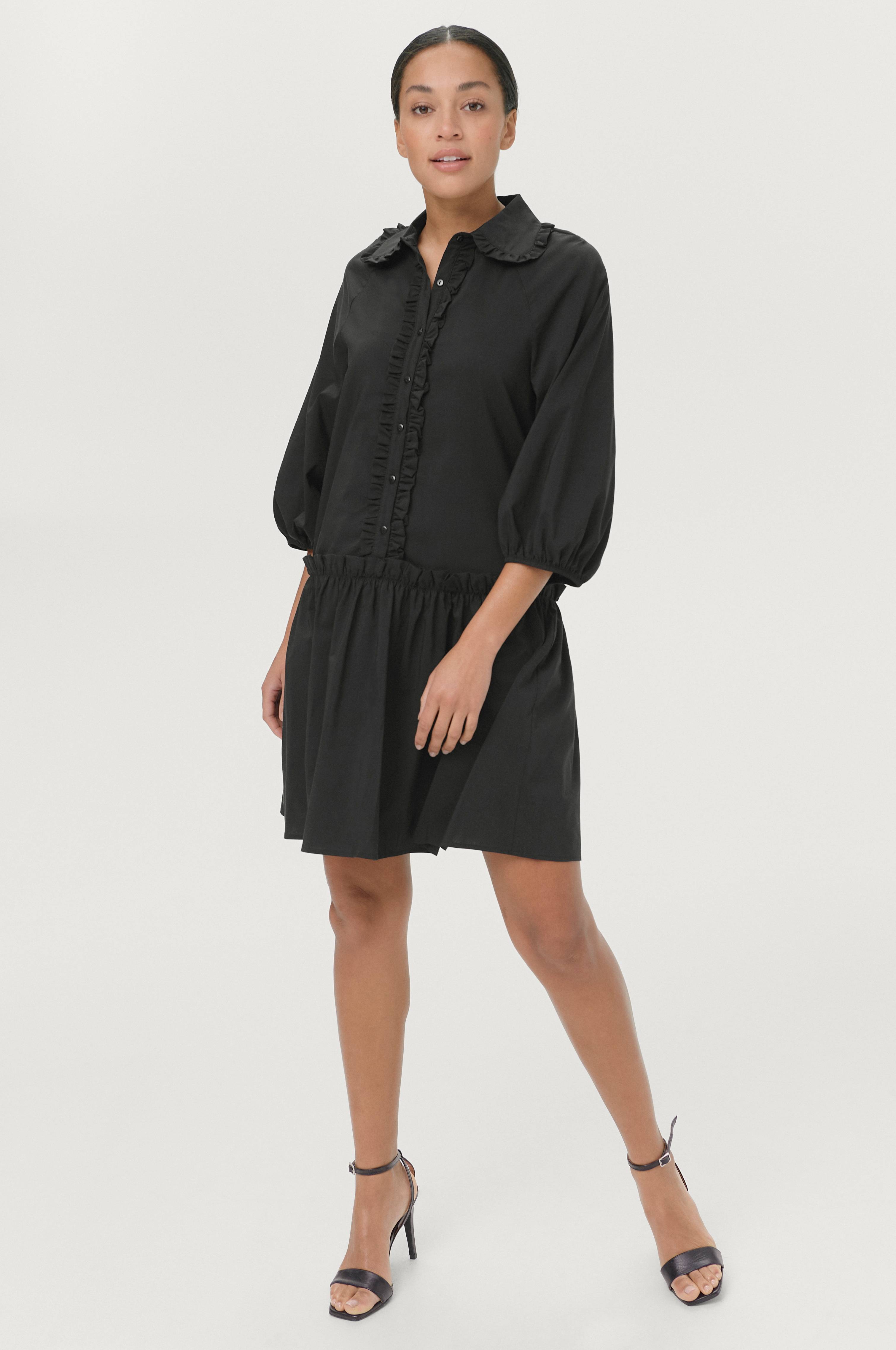 Kjole Ofelia Frill Dress fra Gina Tricot. A-formet oversizemodel i vævet stretchkvalitet med afskæring og lille flæsekant på hoften samt vidde i nederdelen. Afrundet krave med påsyet flæse og stolpelukning ned til nederdelen med flæsekant ved siderne. Vidt, 3/4-langt, raglanskåret ærme med indsat elastik i ærmekant. Længde ca. 93 cm i str. 36.