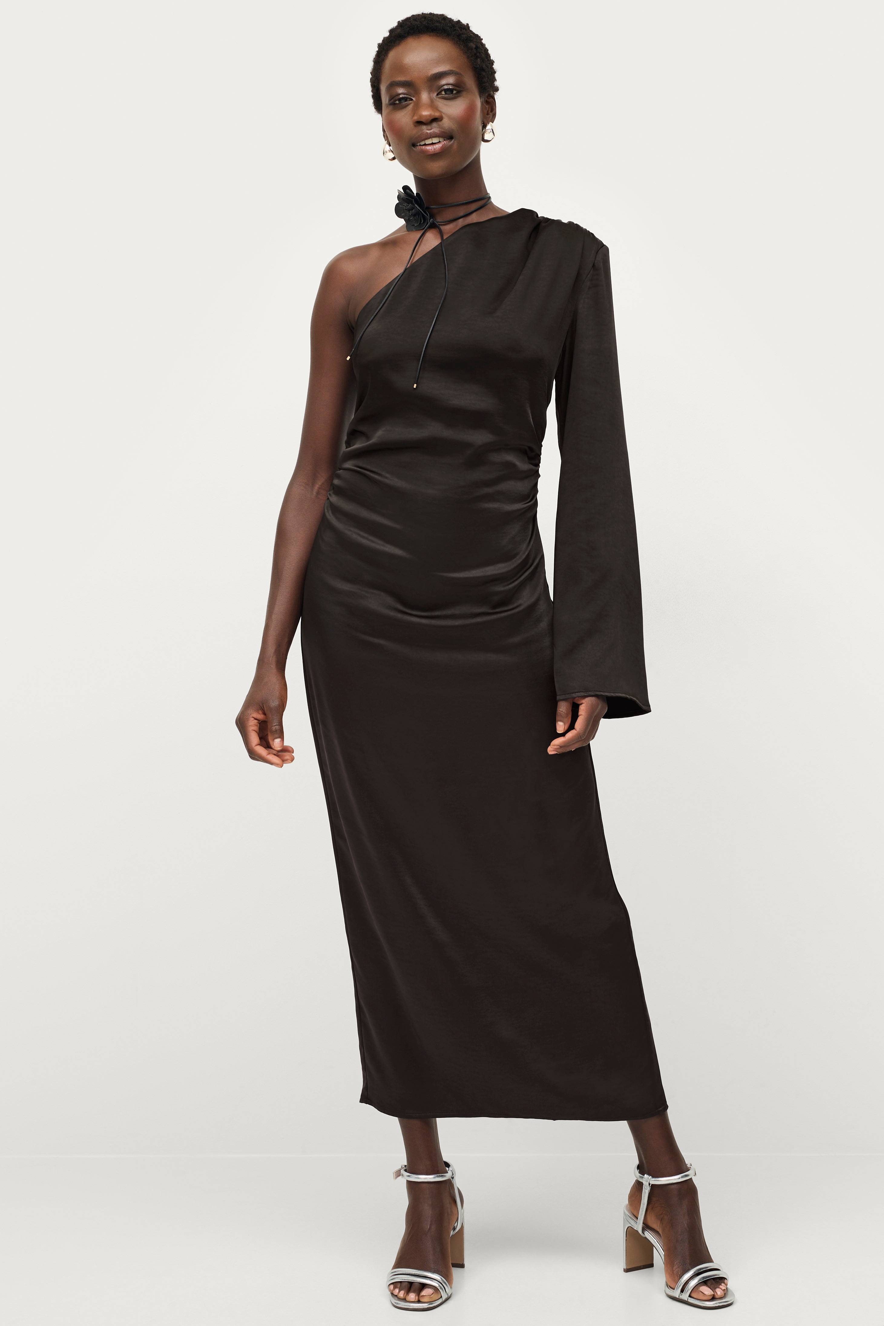 • Enskuldret design• Smal pasform• Drapering i siderne• Langt ærme med svaj• Samling ved skulderen• Skulderpude• Slids bagpå• Fremstillet af satin• Længde: 129 cm i størrelse 36