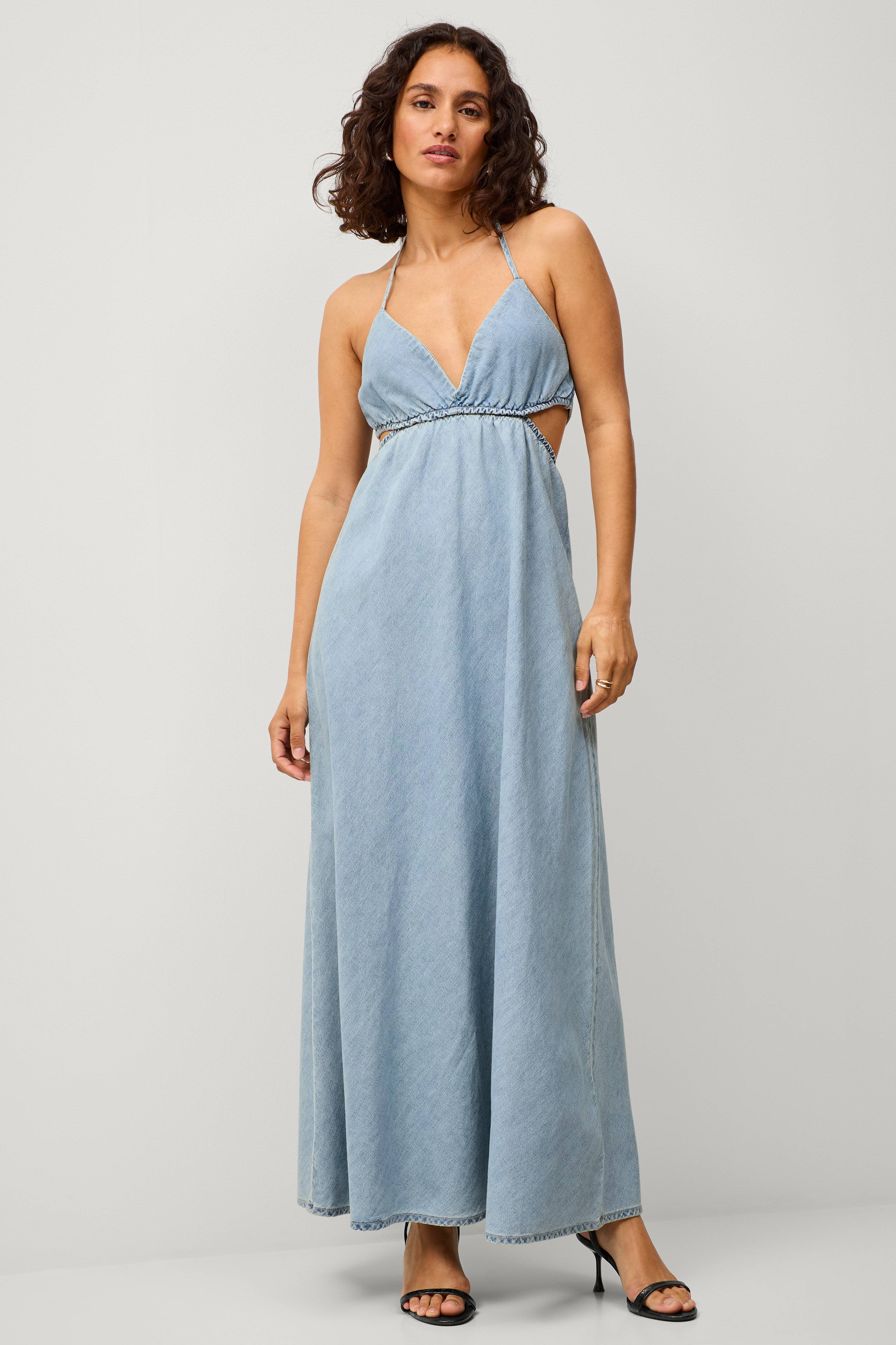 • Lang model med svaj• Udskæring med elastik rundt om oventil• Halterneck med bindebånd• Åben ryg med langt bindebånd på toppen• Længde: 140 cm i størrelse S