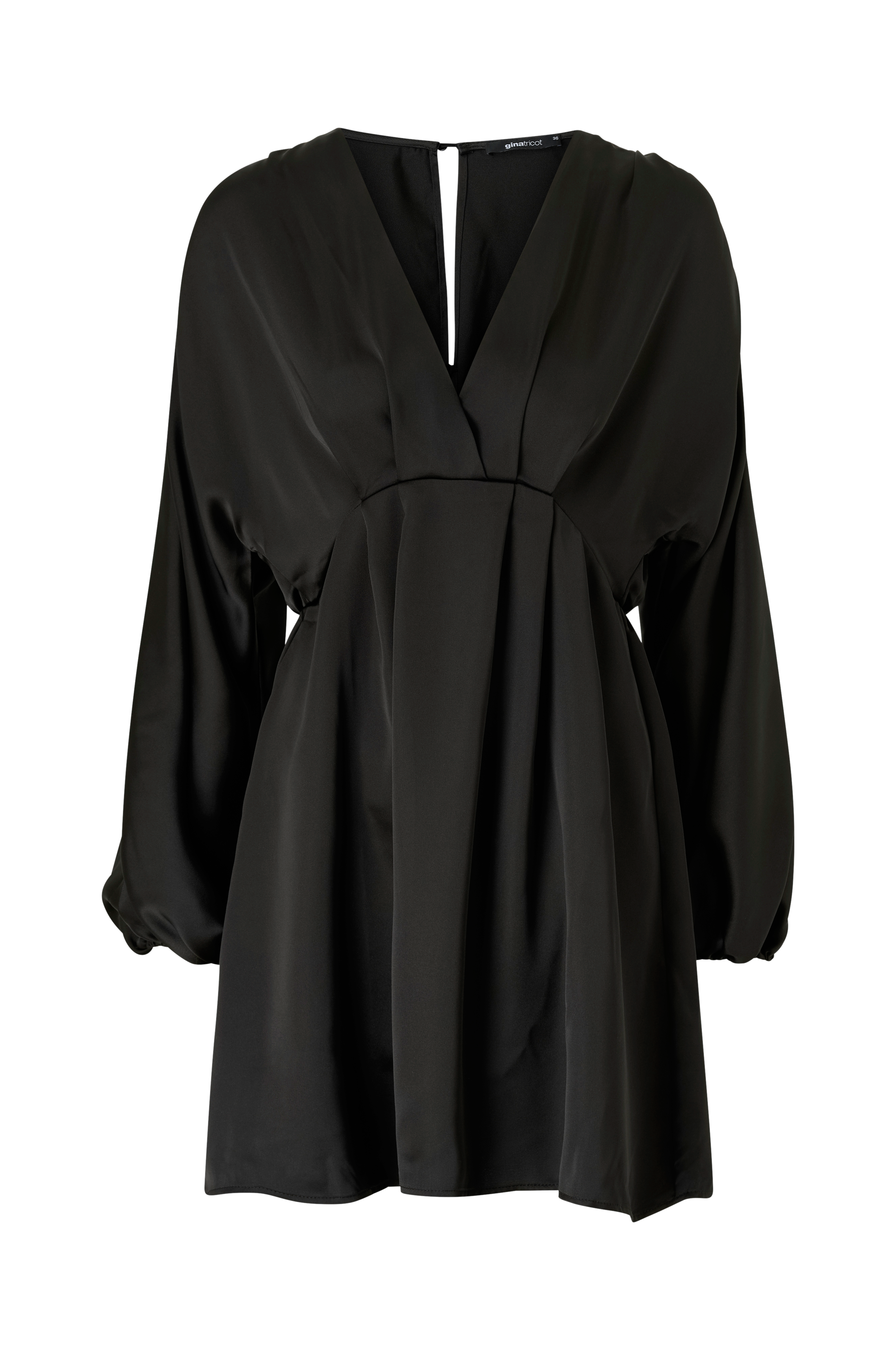 • Figurformede model i satin • Slå-om design oppe foran med åbning og løkkelukning i ryggen • Drapering på skuldrene • Afrundet søm med læg foran og elastik bagpå ved taljen • Ekstra langt, ekstra bredt kimonoærme med elastisk manchet • Længde: 88 cm i størrelse 36