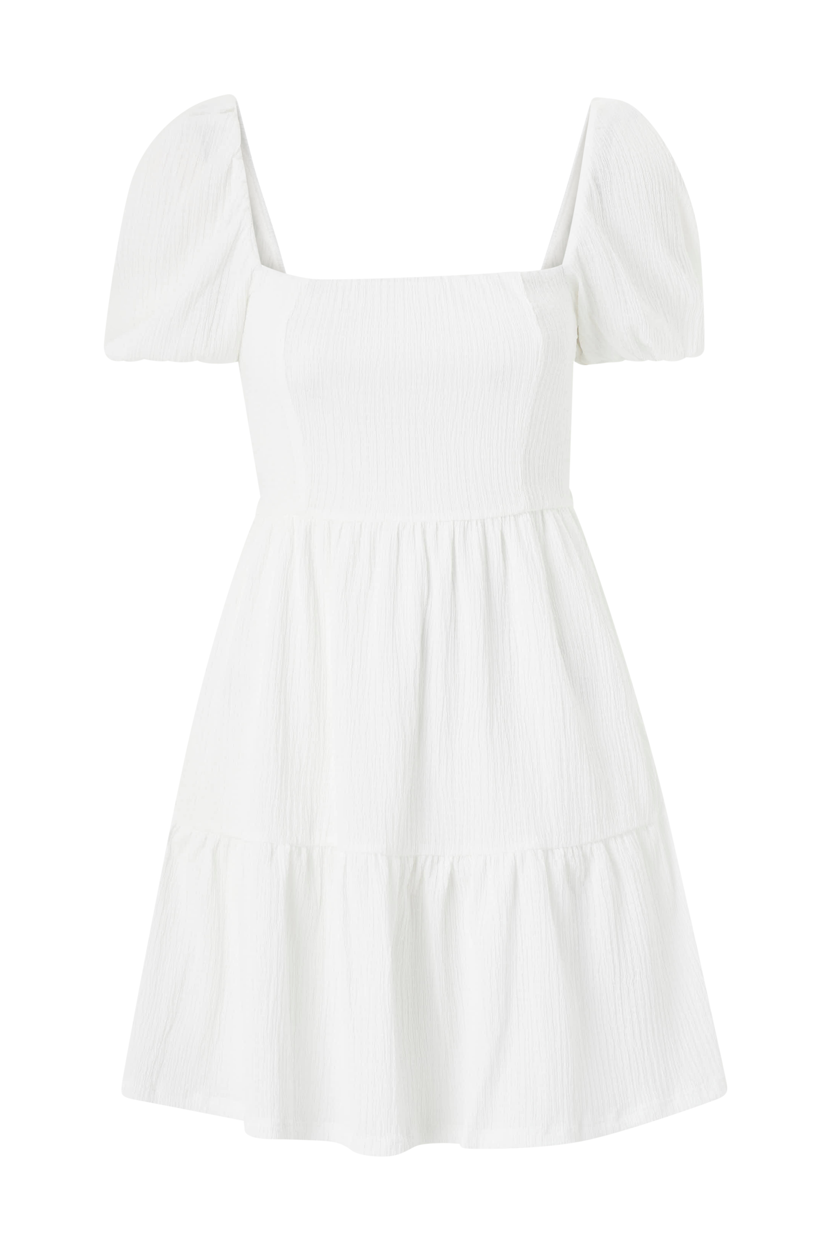 • Let krøllet kjole med åben ryg• Firkantet halsudskæring• Korte ballonærmer• Bindebånd i ryggen• Tekstilforing• Elastik ved taljen og ved manchetterne• Volanter nederst• Normal pasform• Længde: 88 cm i størrelse S