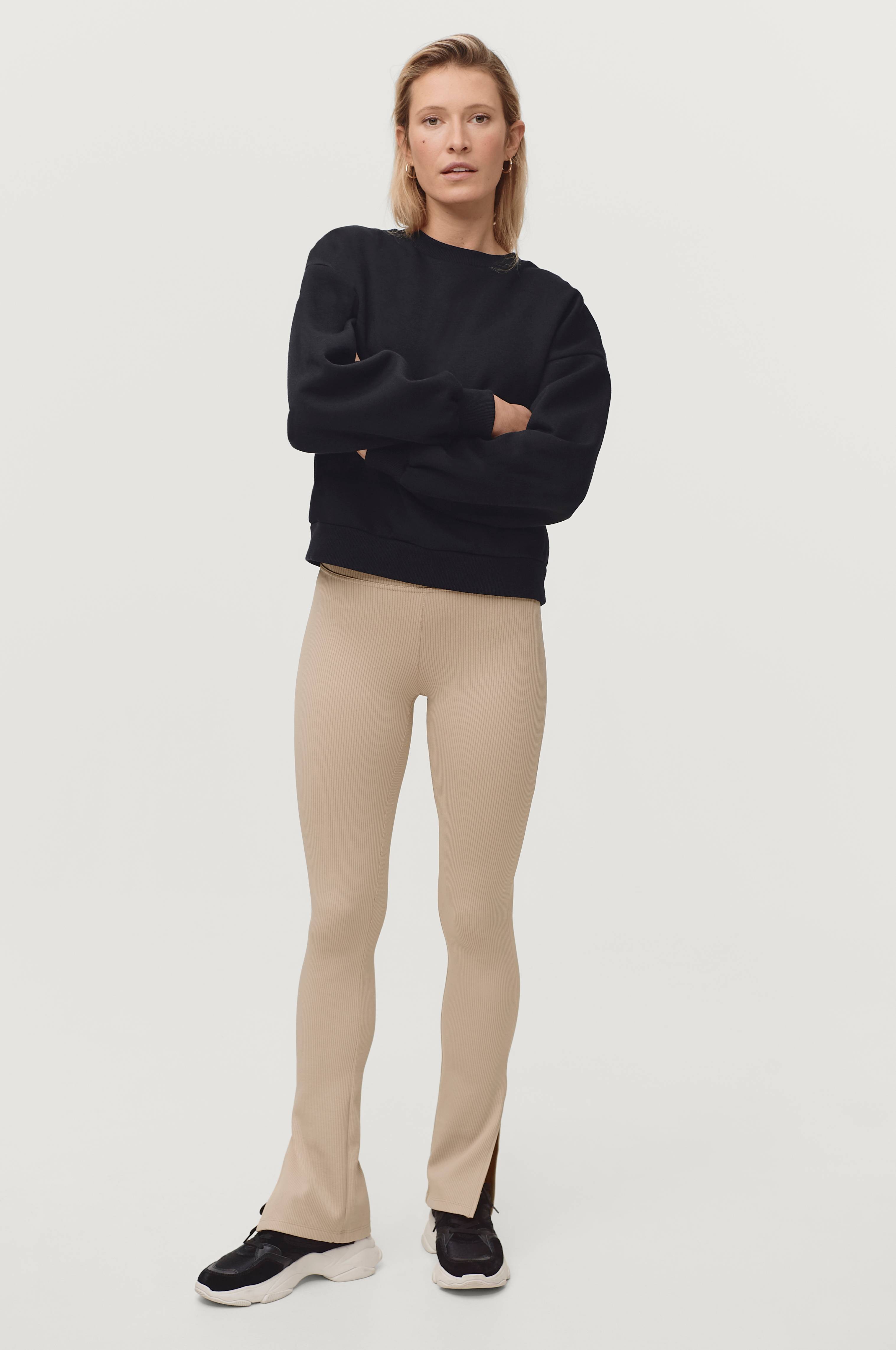 Leggings i ribjersey med slids på benenes yderside forneden. Bred taljeelastik. Indvendig benlængde ca. 78 cm i str. S.