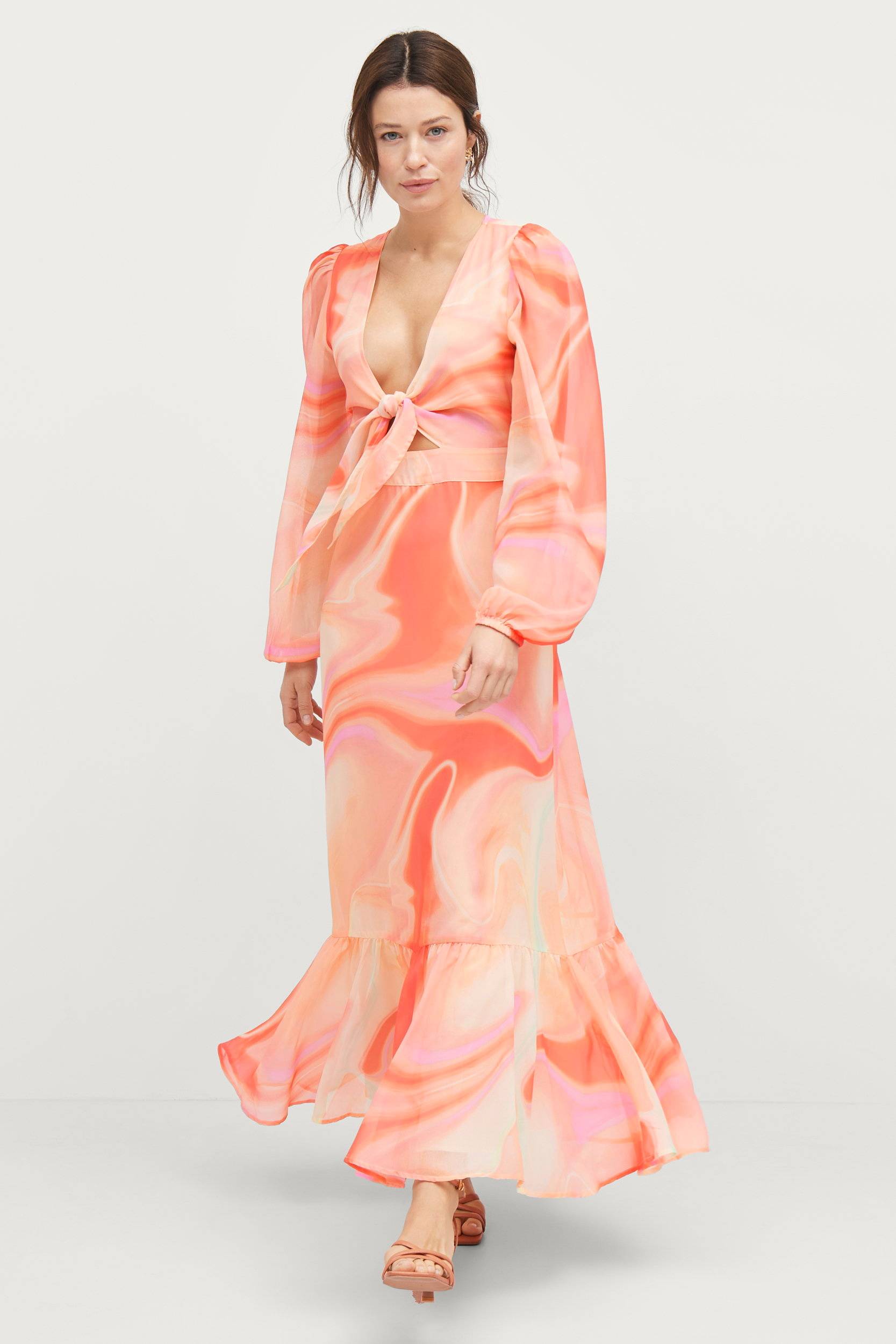 • Lang kjole i chiffon • Dyb v-udskæring med snøring • Ekstra lange ballonærmer • Volant nederst • Tyndt for • Længde: 143 cm i størrelse 36 • Produktet indeholder genindvundet materiale, som genbruges for at reducere mængden af affald samtidigt med at der ikke anvendes nye ressourcer.