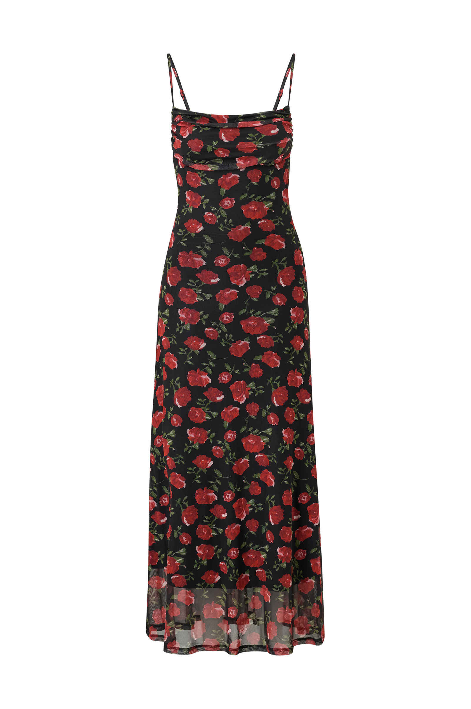 • Foret maxi kjole i mønstret mesh• Tynde, justérbare skulderstropper med bindbart bånd i ryggen• Udskæring under brystet• Dyb udskæring i ryggen• Længde: 135 cm i størrelse S