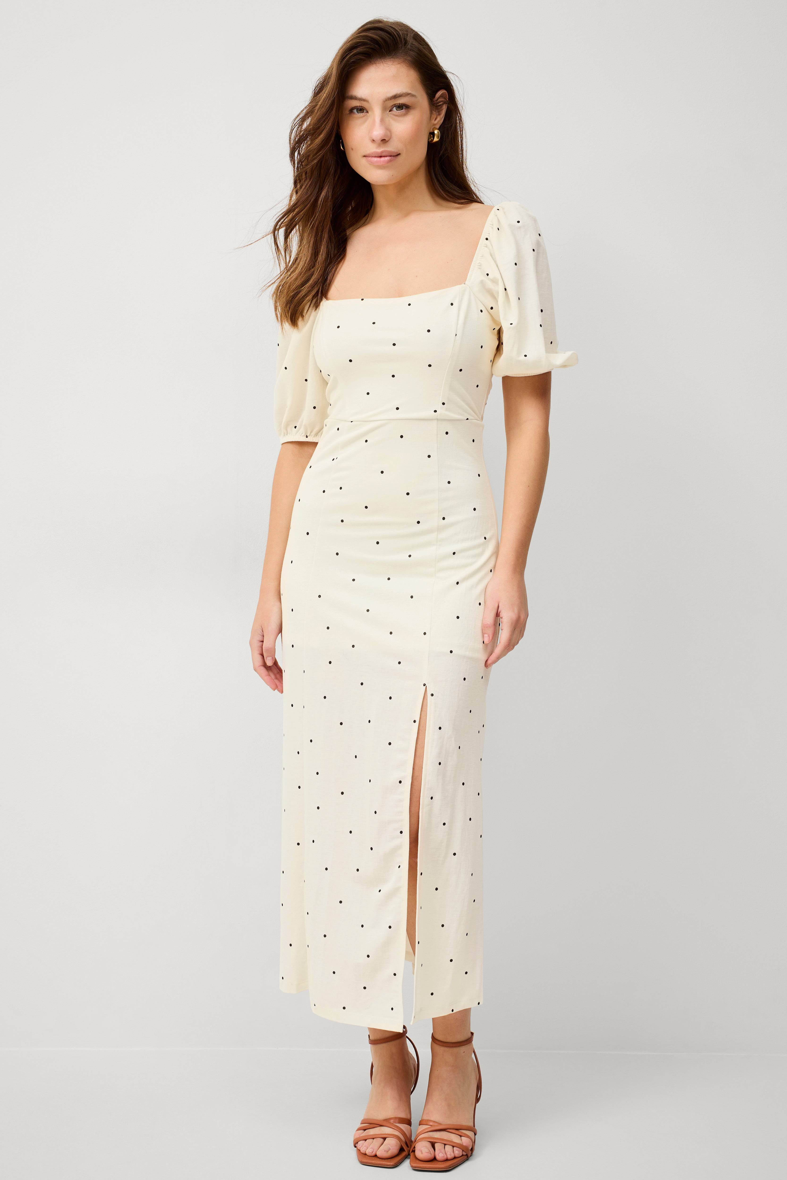 • Lang, figurformede model• Kantet halsudskæring foran med elastik over skuldrene• Kort ballonærme med elastisk manchet• Høj slids nede foran• Foret• Længde: 131 cm i størrelse S