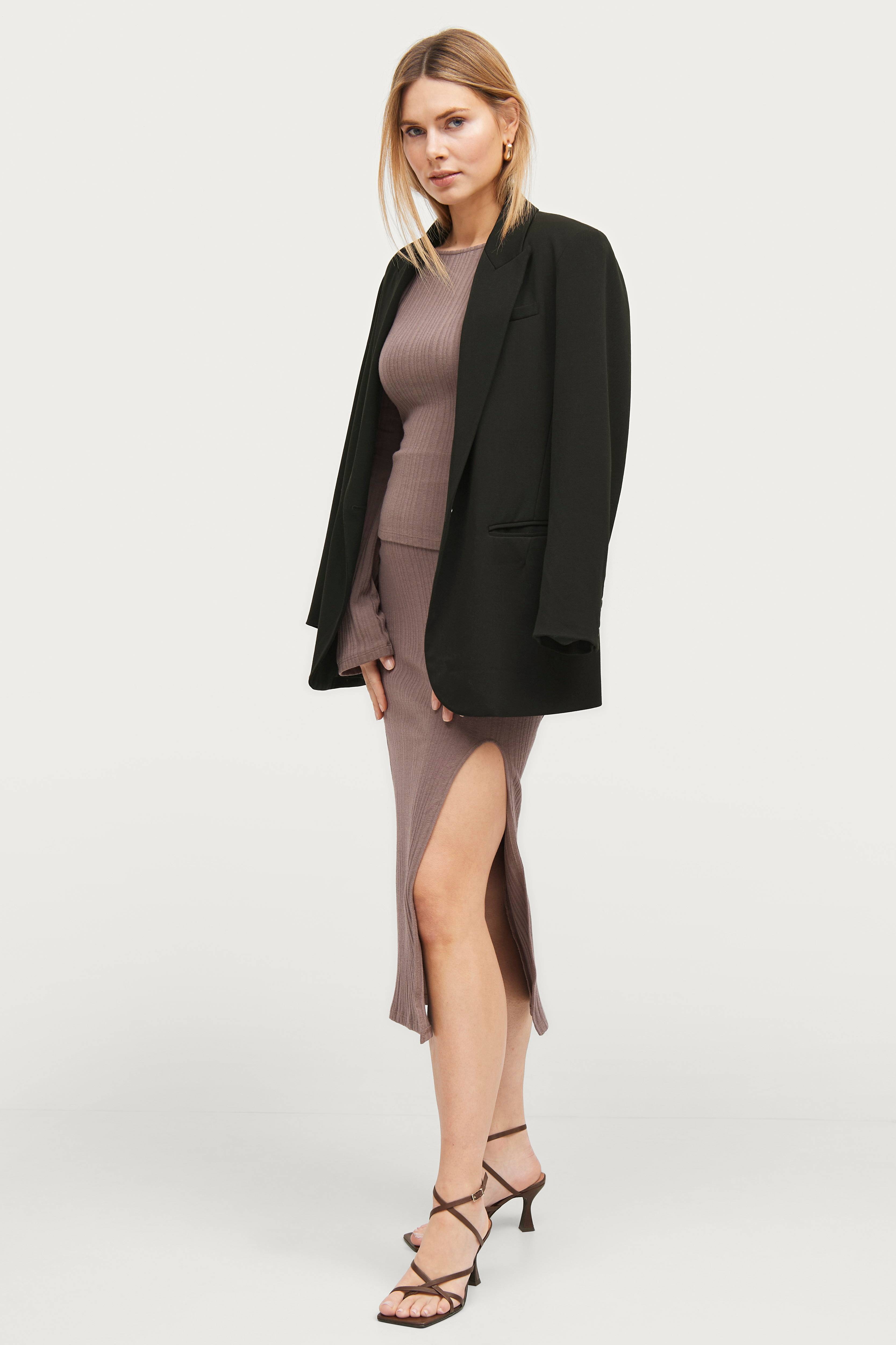 • Snæver, ribstrikket model• Elastisk bånd på toppen• Høj slids foran• Længde: 82 cm i størrelse S
