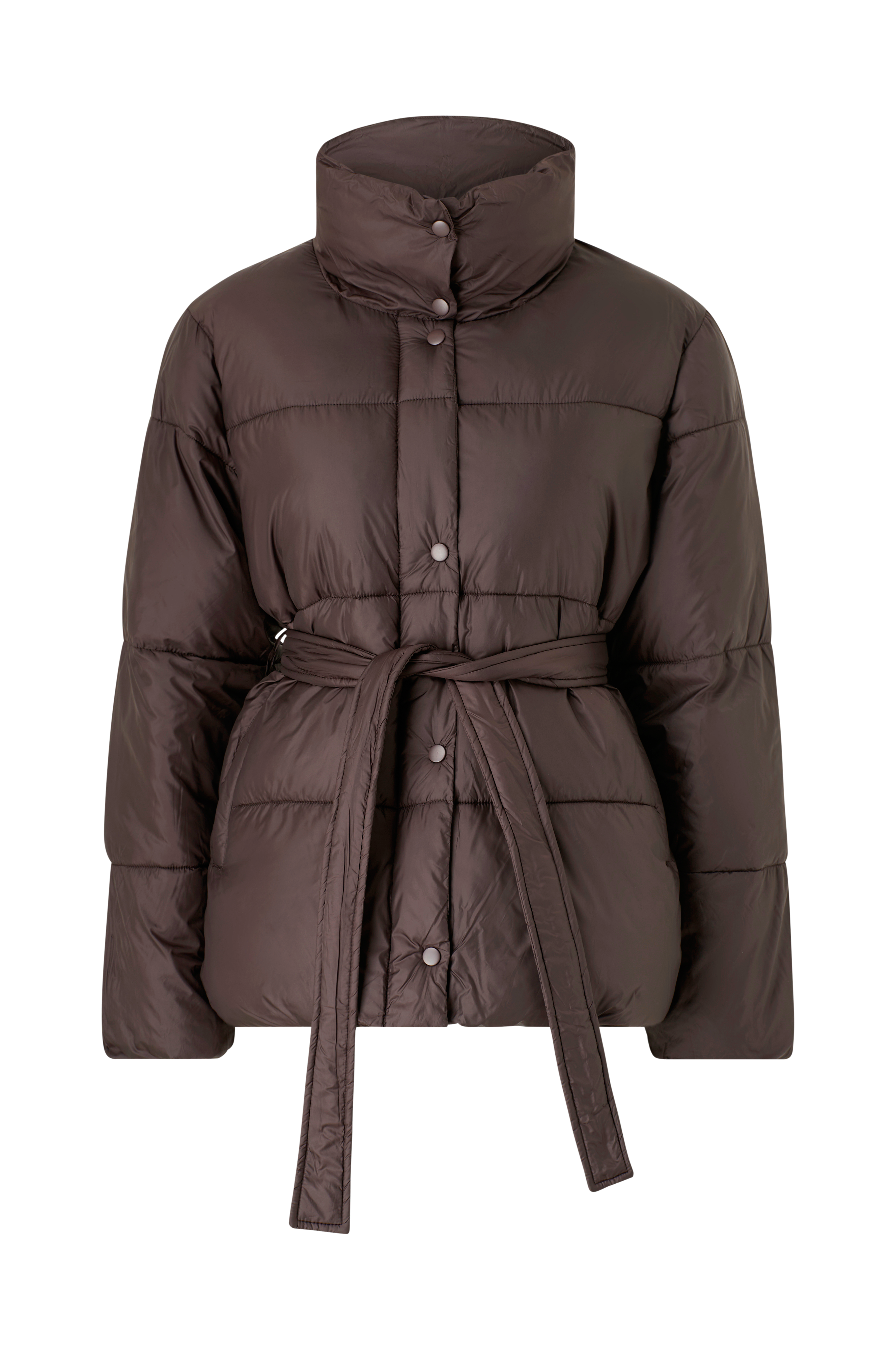 • Foret pufferjakke med høj krave• Lynlåslukning med vindflap og trykknapper• Aftageligt bindebælte ved taljen• Sidelommer• Længde: 71 cm i størrelse S