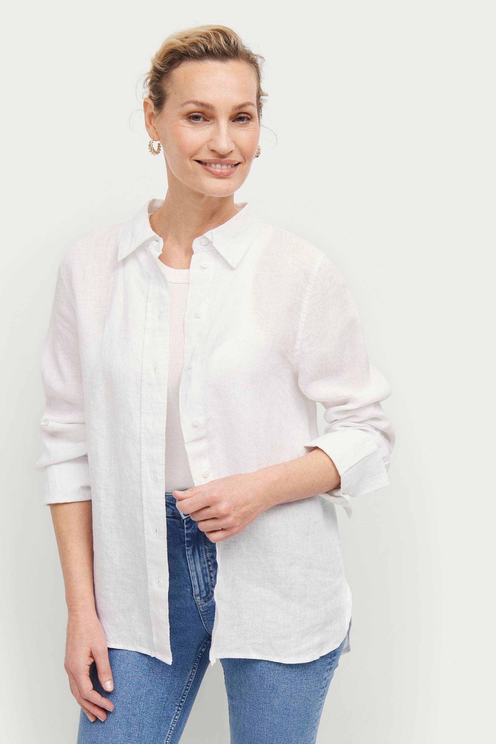 Hørskjorten er stilfuld med brede manchetter. Men knapperne måtte jeg flytte i, da ærmerne er lidt lange. Deraf de 4 stjerner.
