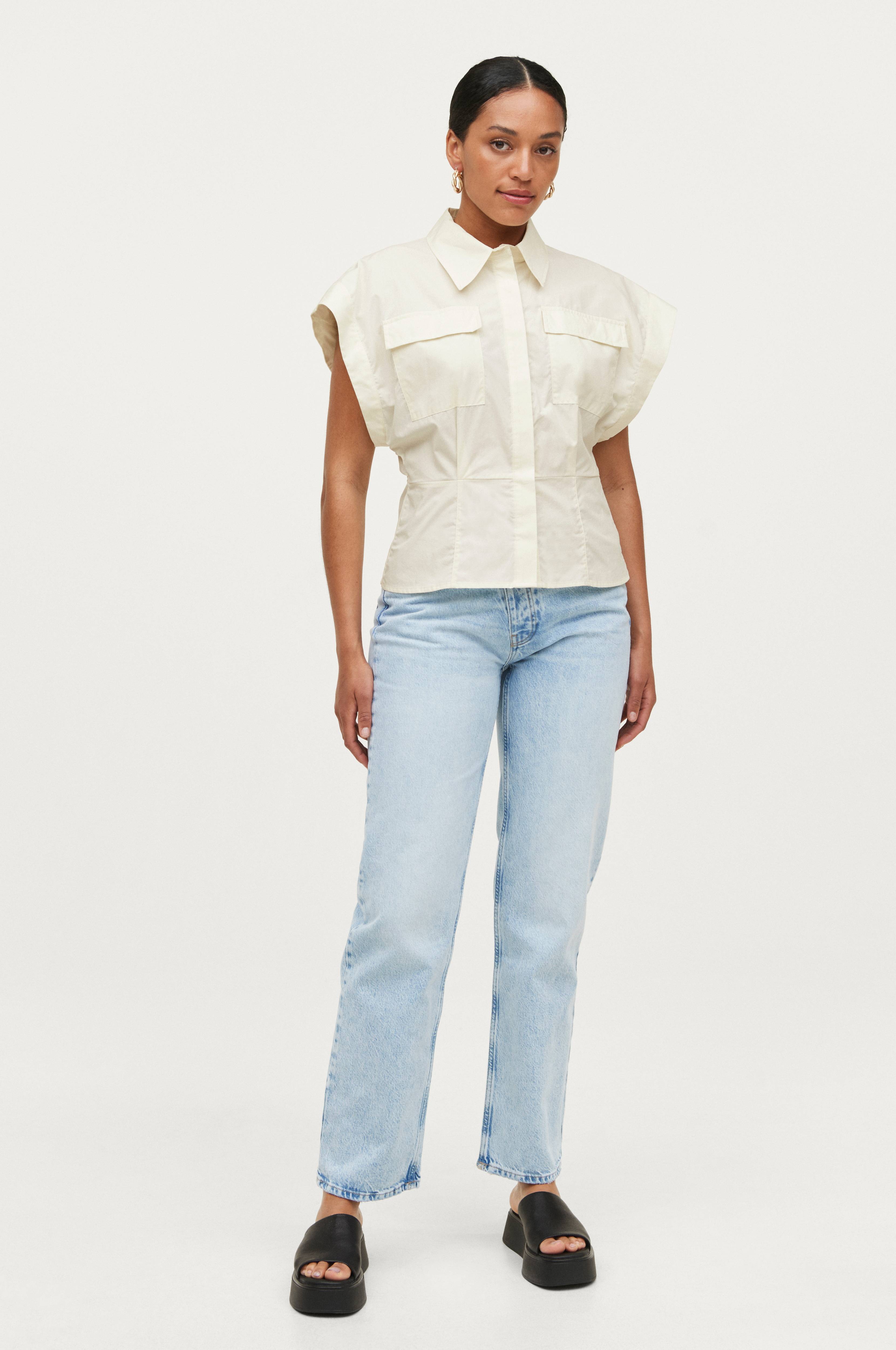• Firkantet pasform• Korte, brede ærmer• Figursyet talje• Skjult knapstolpe foran• Brystlommer• Læg foran og bagpå