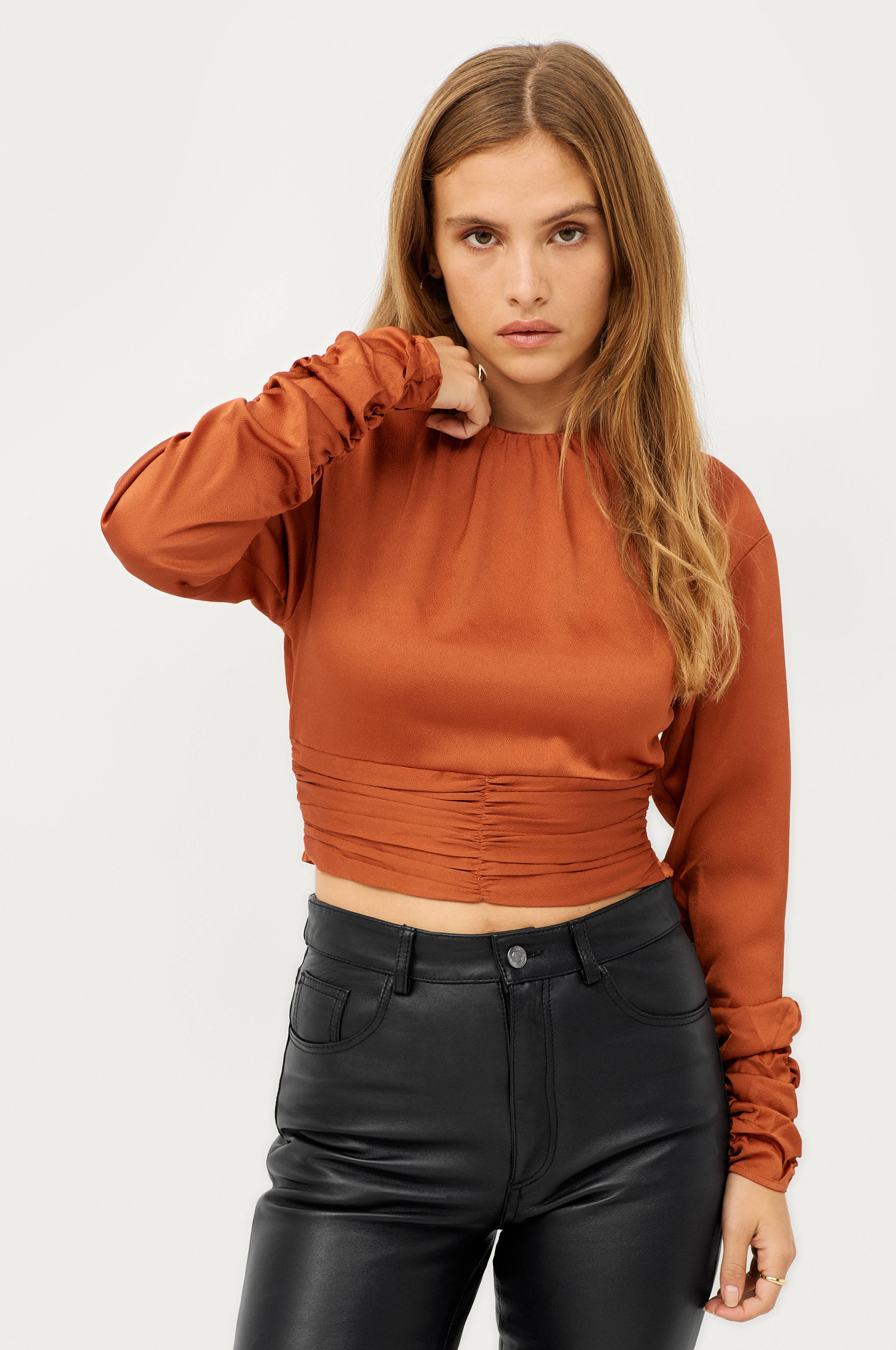 Bluse i vævet kvalitet med glans. Kort model med rynket drapering forneden foran og smockelastik forneden bagpå. Rund hals med rynkning foran og slids med knap bagpå. Lange ærmer med elastisk rynkning i ærmekant.