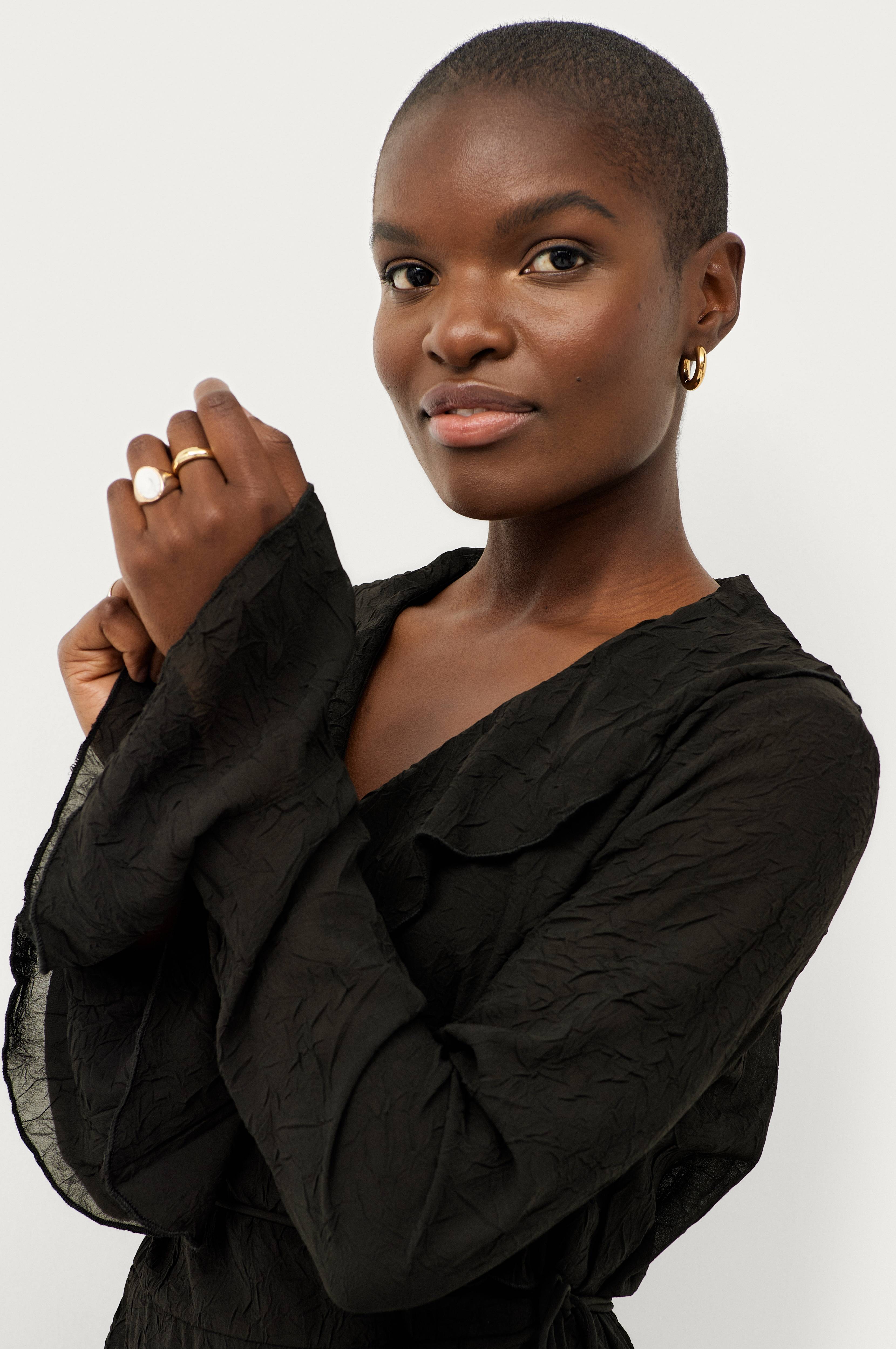 • Åben model med bindbart bånd ved taljen• Volant ved fronten og nederst• Langt ærme med volant ved manchetterne• For nederst• Længde: 93 cm i størrelse S