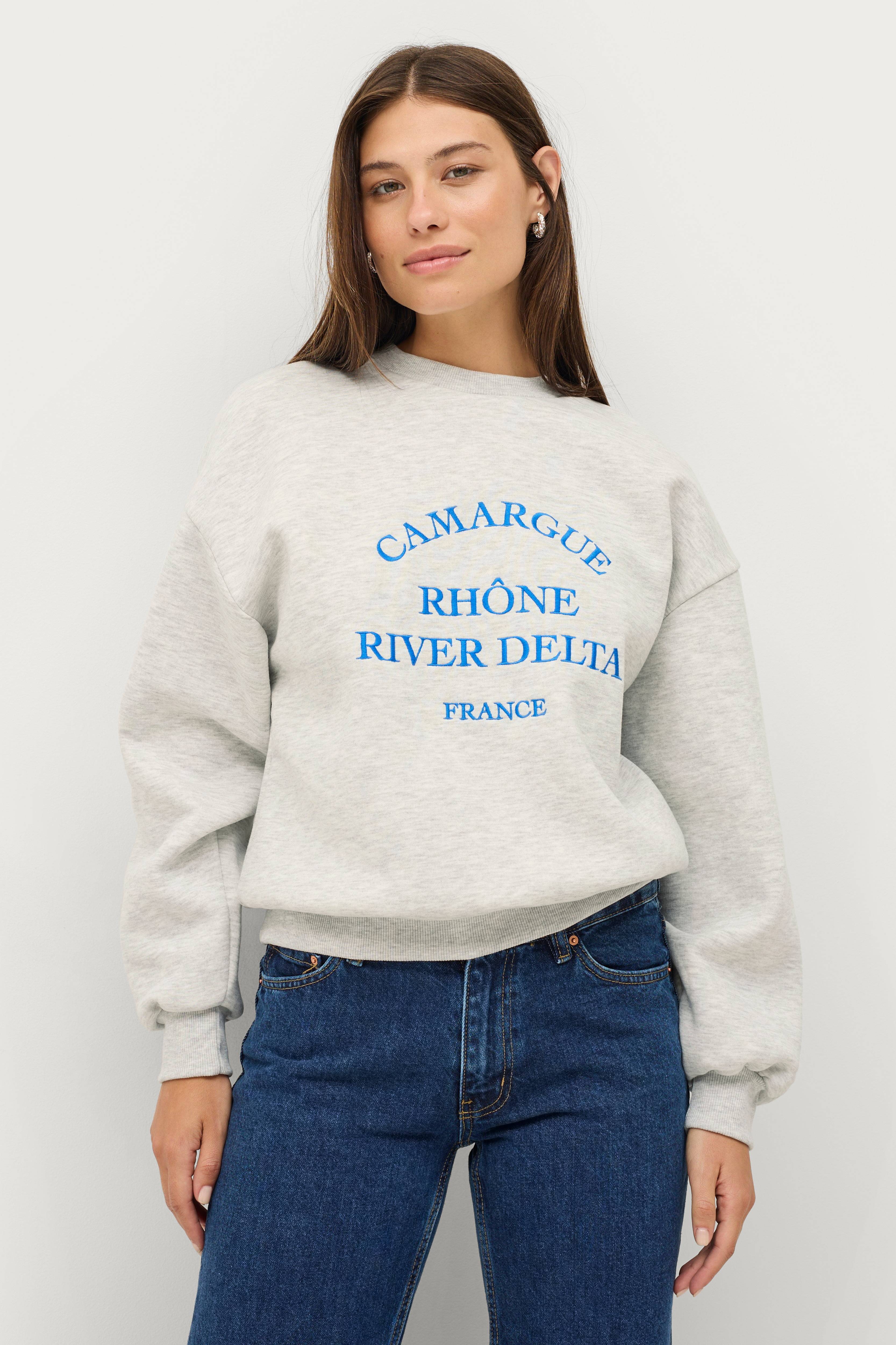 - Lige oversizemodel- Broderier/print foran- Rund hals med rib- Rib i ærmekant og forneden- Børstet inderside