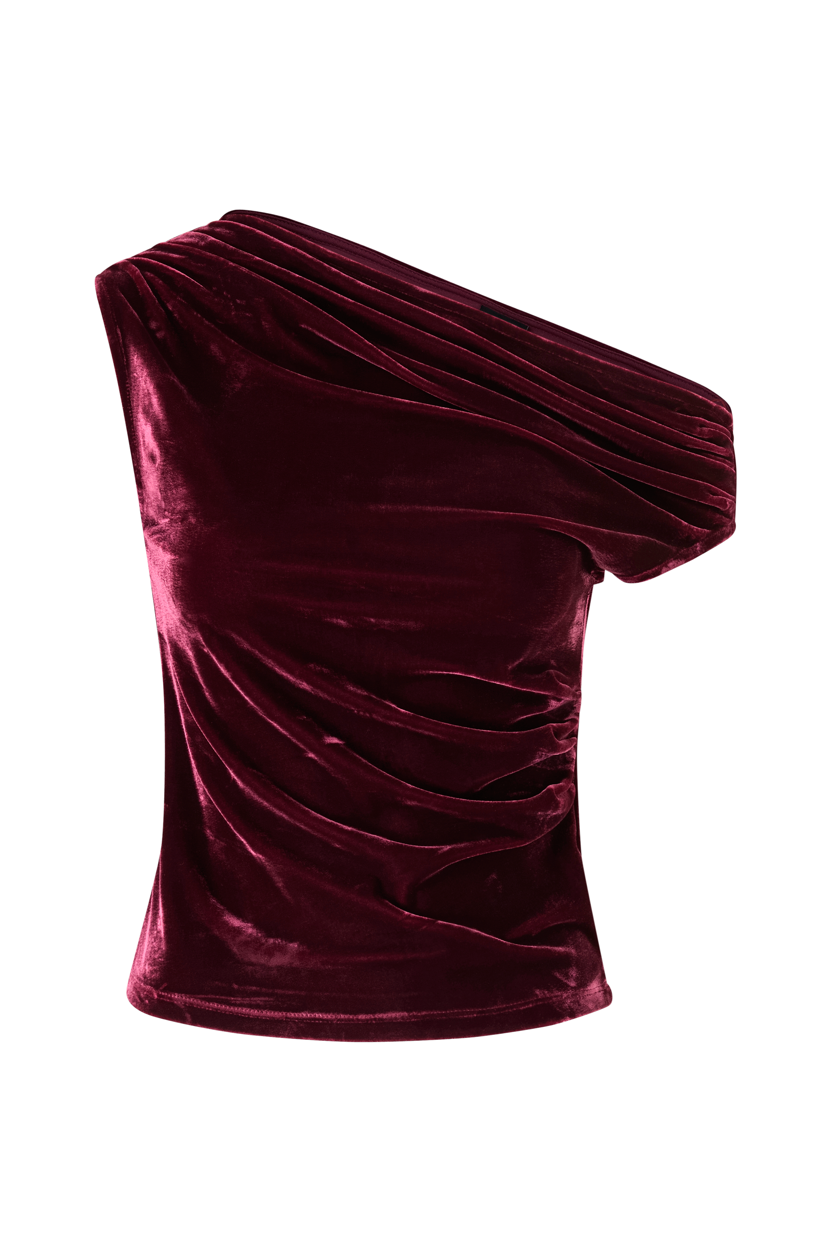 • Elastisk, figursyet, ærmeløs top i fløjl• Asymmetrisk, draperet halsudskæring• Drapering i den ene side• Lidt længere, afrundet forside