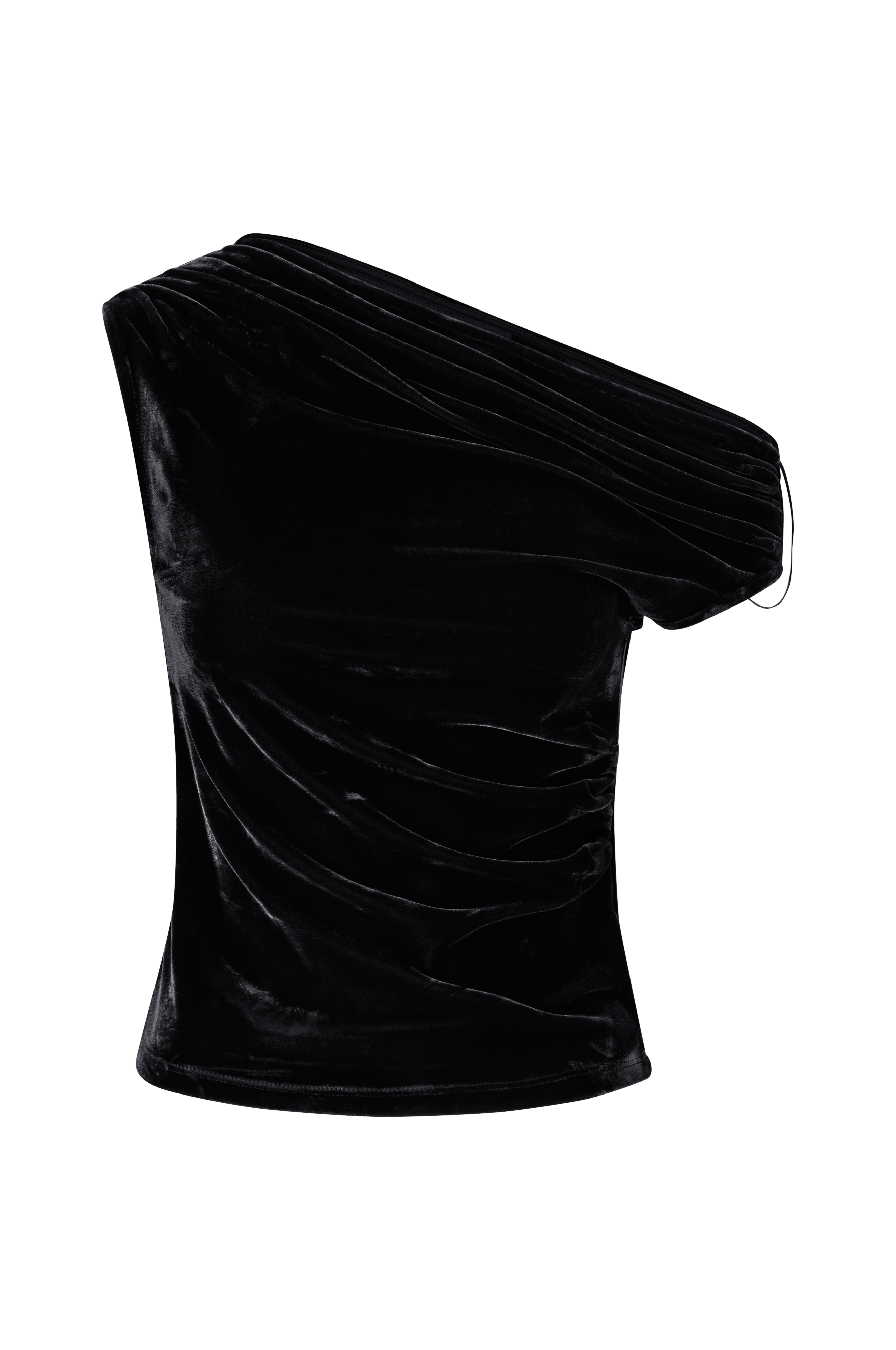 • Elastisk, figursyet, ærmeløs top i fløjl• Asymmetrisk, draperet halsudskæring• Drapering i den ene side• Lidt længere, afrundet forside