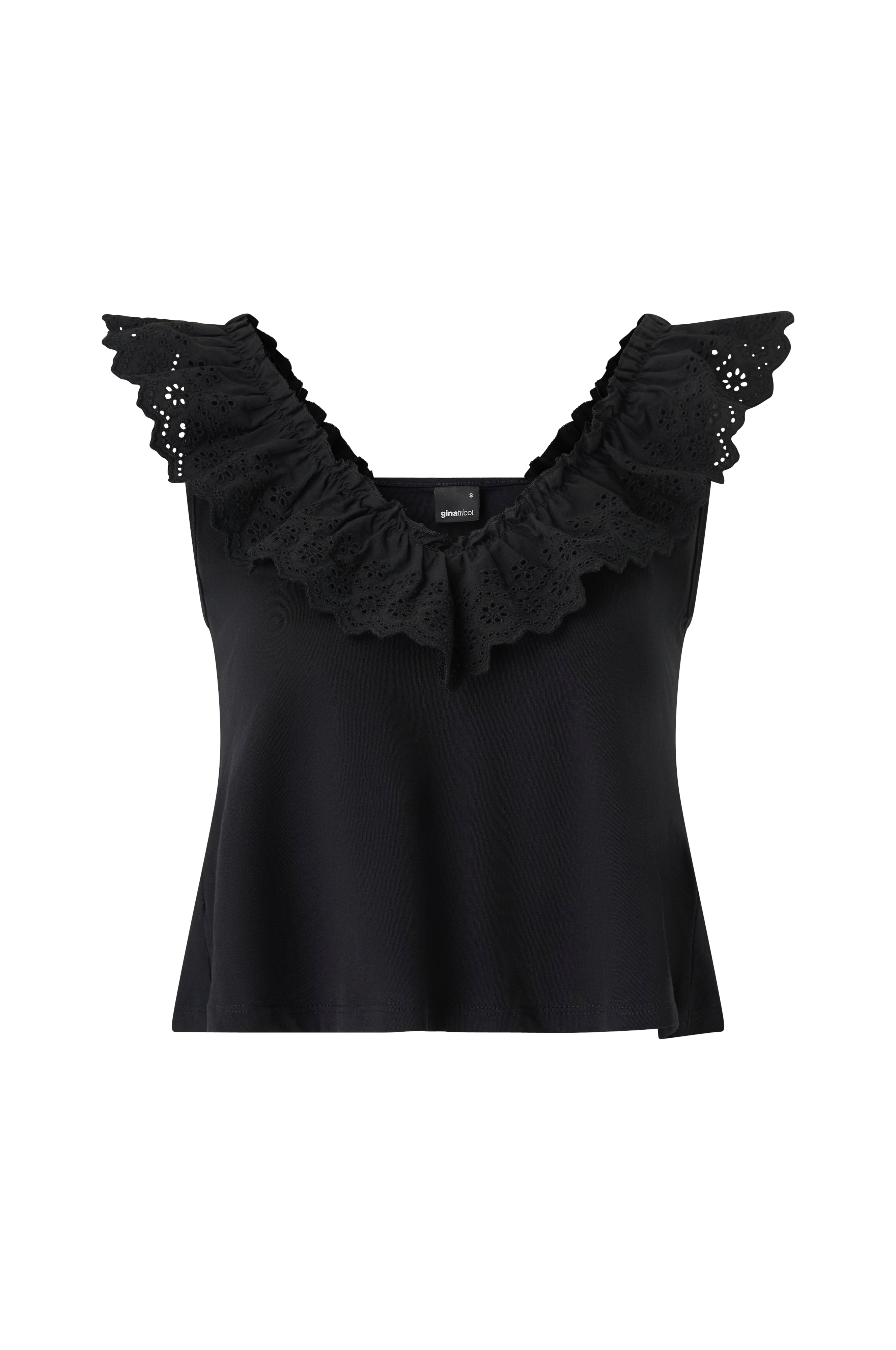 • Elastisk, ærmeløs top i bomuld• Flæsekant med hulbroderier på halsen og over skuldrene